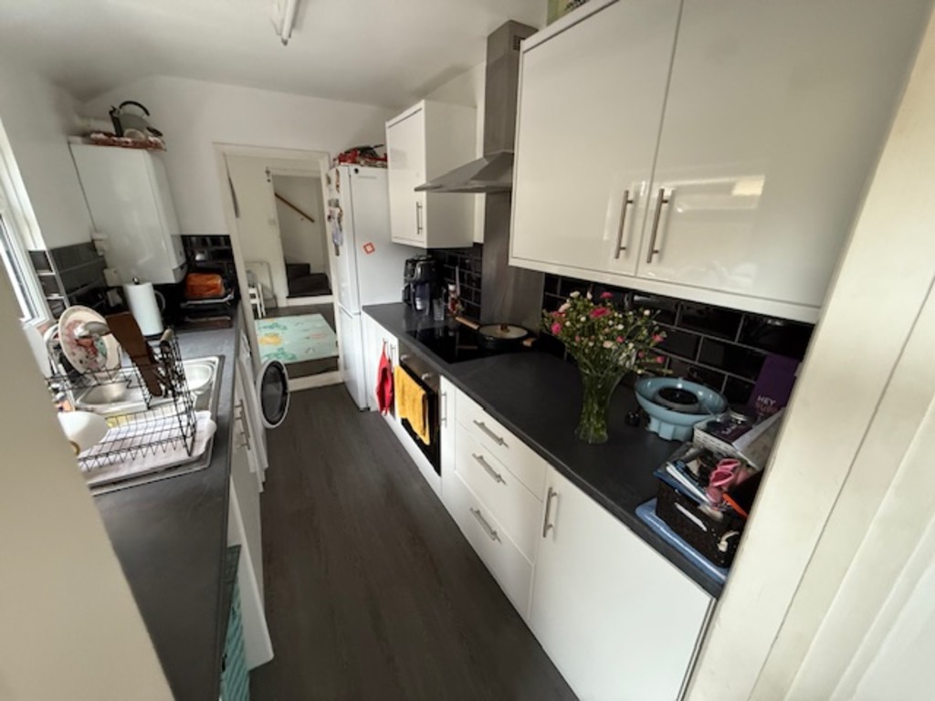 KITCHEN High and low level units fitted with built in electric oven and hob. Double glazed window and radiator to wall. Space for washing machine and fridge freezer