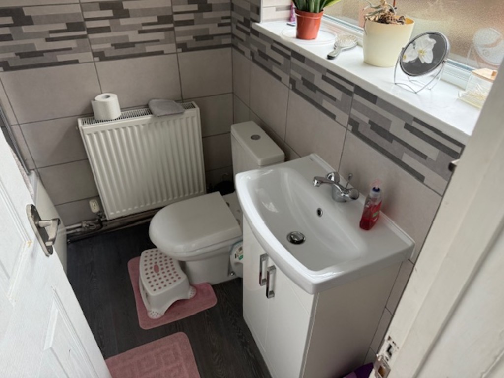 DOWNSTAIRS BATHROOM White suite fitted with toilet sink and bath with shower over. Double glazed window and white wall radiator