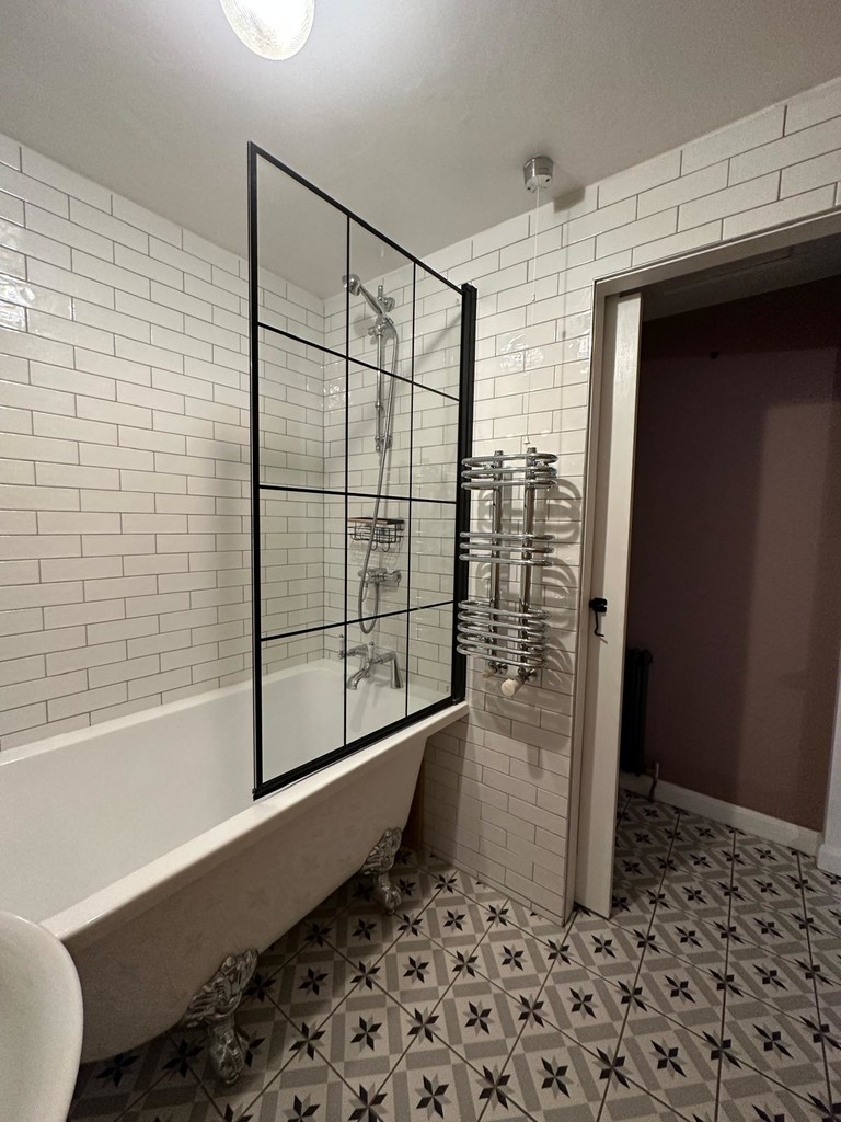 BATHROOM modern bathroom with tiled flooring and walls, white bath with chrome feet, shower over, hand basin, low level w/c, heated towel rail, double glazed window