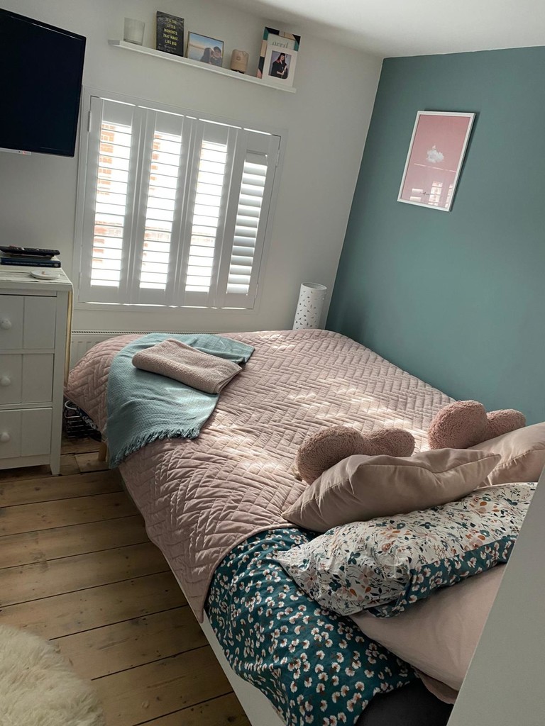 BEDROOM wall radiator, cupboard with worksurface, double glazed window