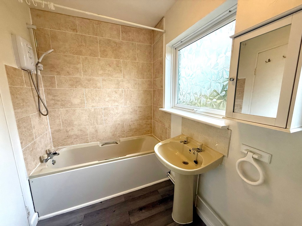 BATHROOM suite comprising of baht with electric shower over, hand basin, low level w/c, vanity unit, wall radiator, double glazed window to rear aspect