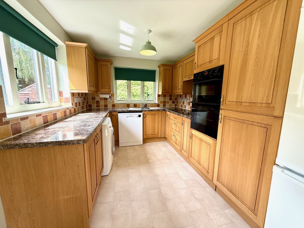 KITCHEN/DINER 18' 0" x 8' 6" (5.50m x 2.60m) variety of wall and base units, fitted cooker hood, ceramic hob, double electric oven, sink and a half with drainer, worksurfaces with tiled splashback, freestanding washing machine, dishwasher, fridge/freezer, triple aspect double glazed windows, double glazed door leading to rear garden, wall radiator