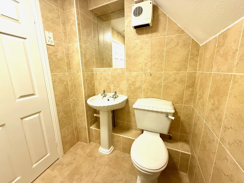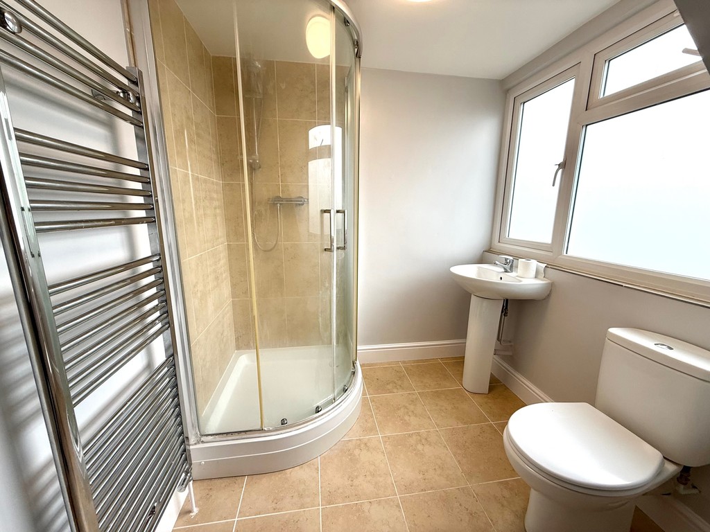 ENSUITE Shower enclosure, low level wc, sink and pedestal, heated towel rail, double glazed window to rear