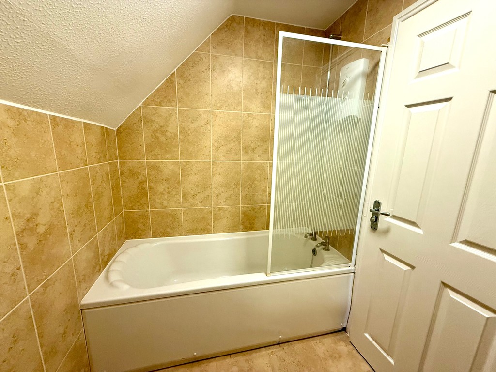 BATHROOM Tiled walls and flooring, bath with electric shower over, sink and pedestal, low level wc, electric heater, shaving point