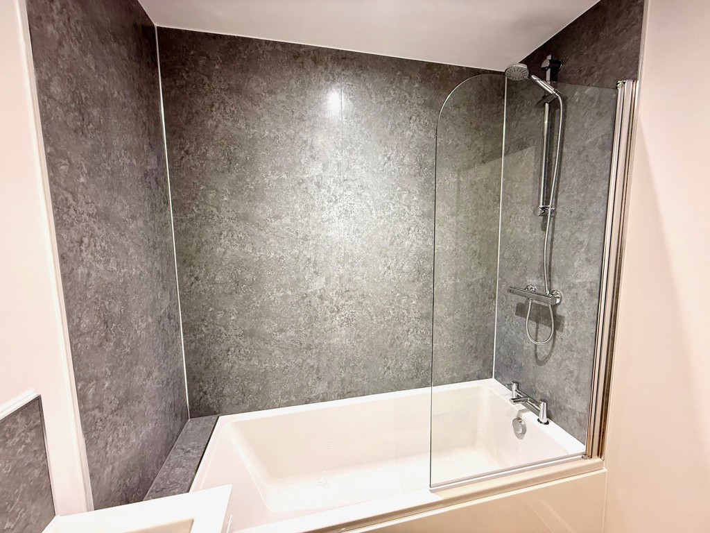 Modern white suite comprising a bath with thermostatic shower over, wall panelling to the suite area, wash hand basin with vanity unit beneath, and low-level WC. Additional features include a heated towel rail