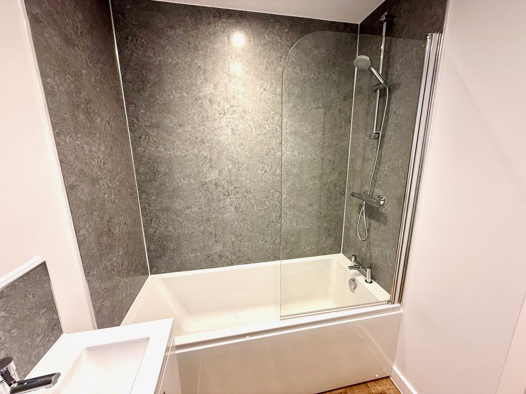 Modern white suite comprising a bath with thermostatic shower over, wall panelling to the suite area, wash hand basin with vanity unit beneath, and low-level WC. Additional features include a heated towel rail