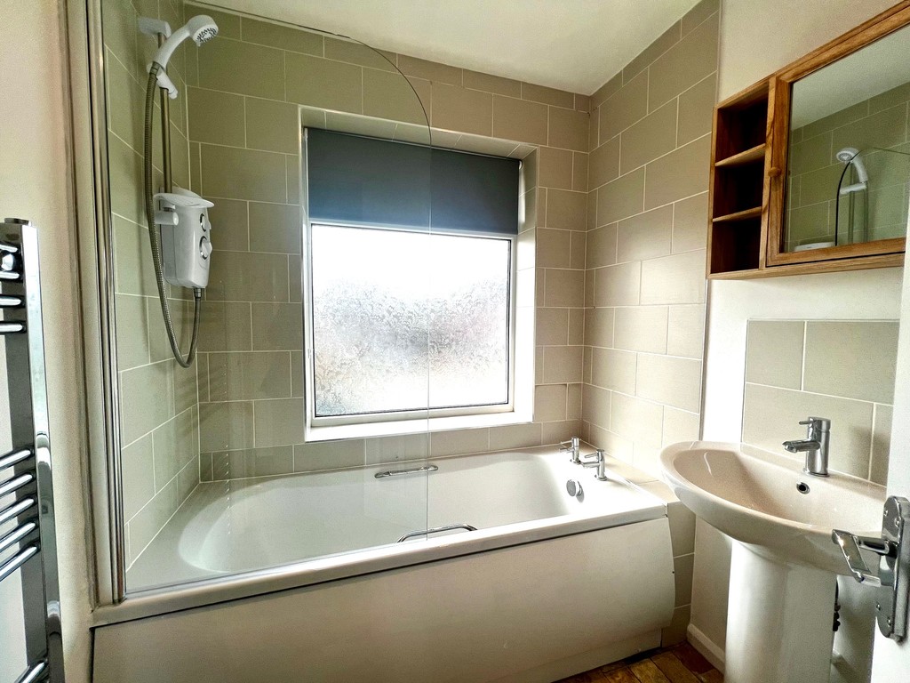 BATHROOM white suite comprising of bath, electric shower fitted over, sink and pedestal, low level w/c, heated towel rail, vanity unit, window to front aspect