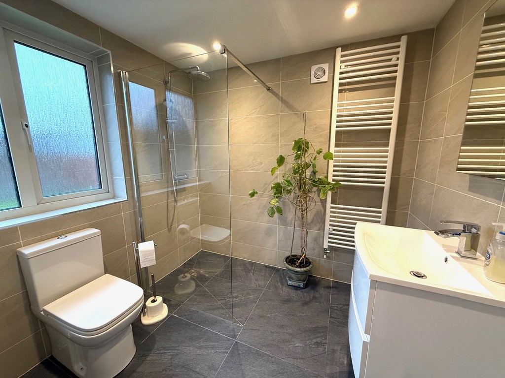 WET ROOM A stylish modern wet room with fully tiled flooring and walls, walk-in shower, low level WC, vanity hand basin, heated towel rail, and double glazed window to the rear.