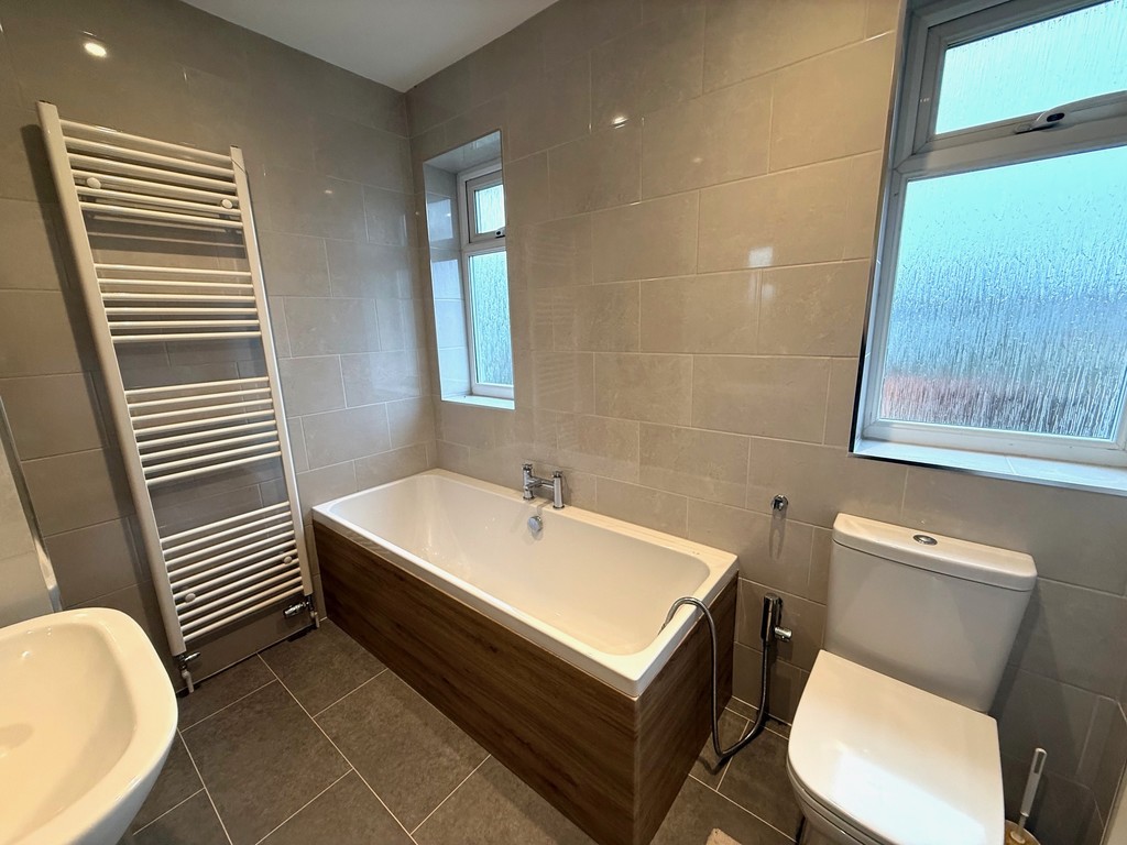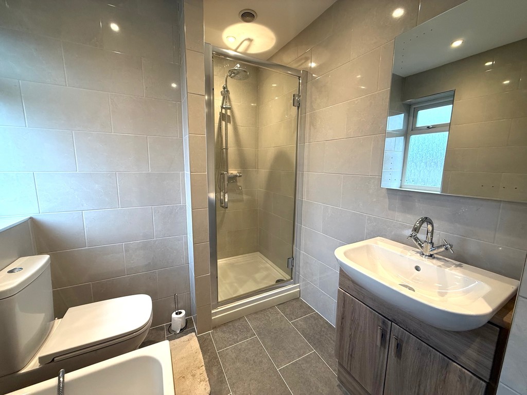 BATHROOM Modern family bathroom with tiled flooring and walls, shower enclosure, bath with mixer tap, low level WC, vanity hand basin, heated towel rail, and double glazed window.