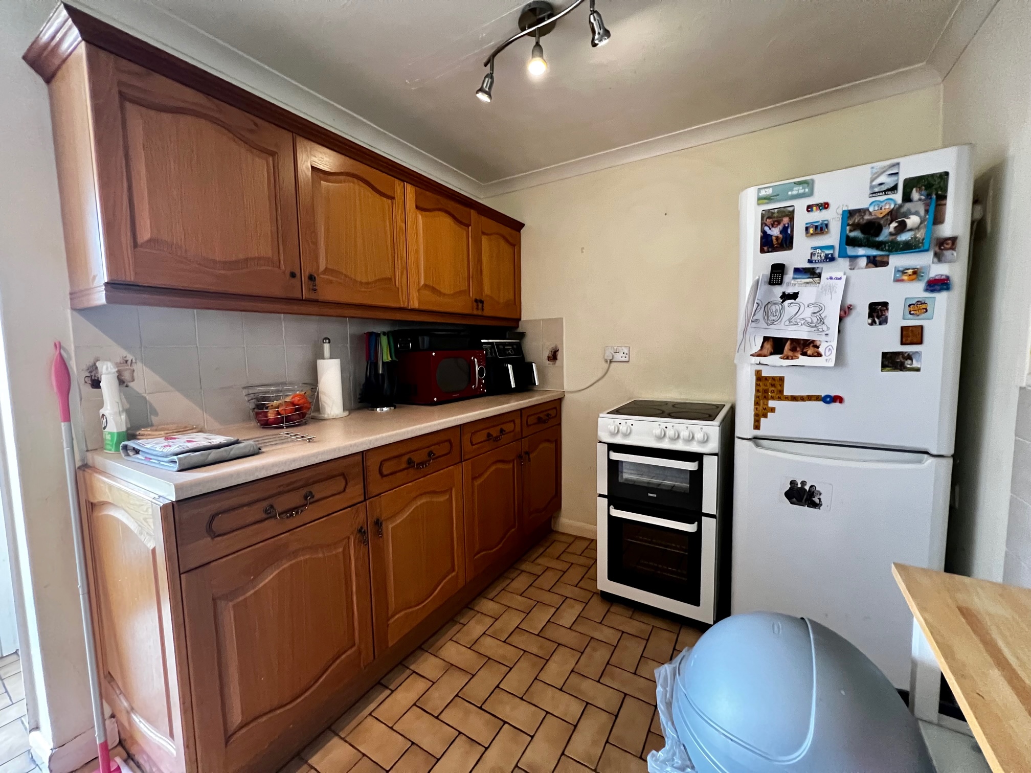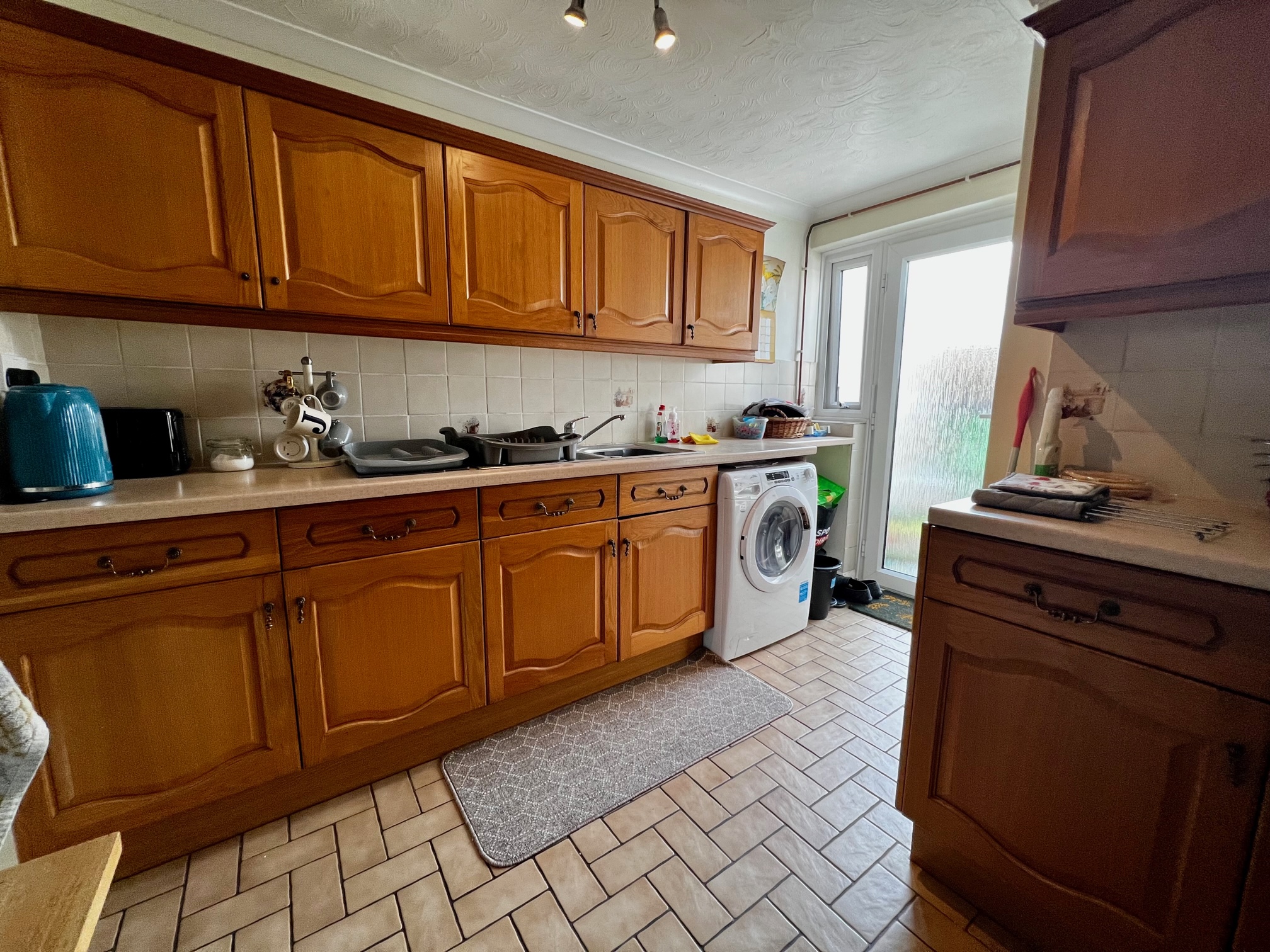 kitchen 3.56m by 2.24m variety of wall and base units, double electric oven with ceramic hob, fridge/freezer, space for washing machine, stainless steel sink and a half, double glazed door and window to rear aspect