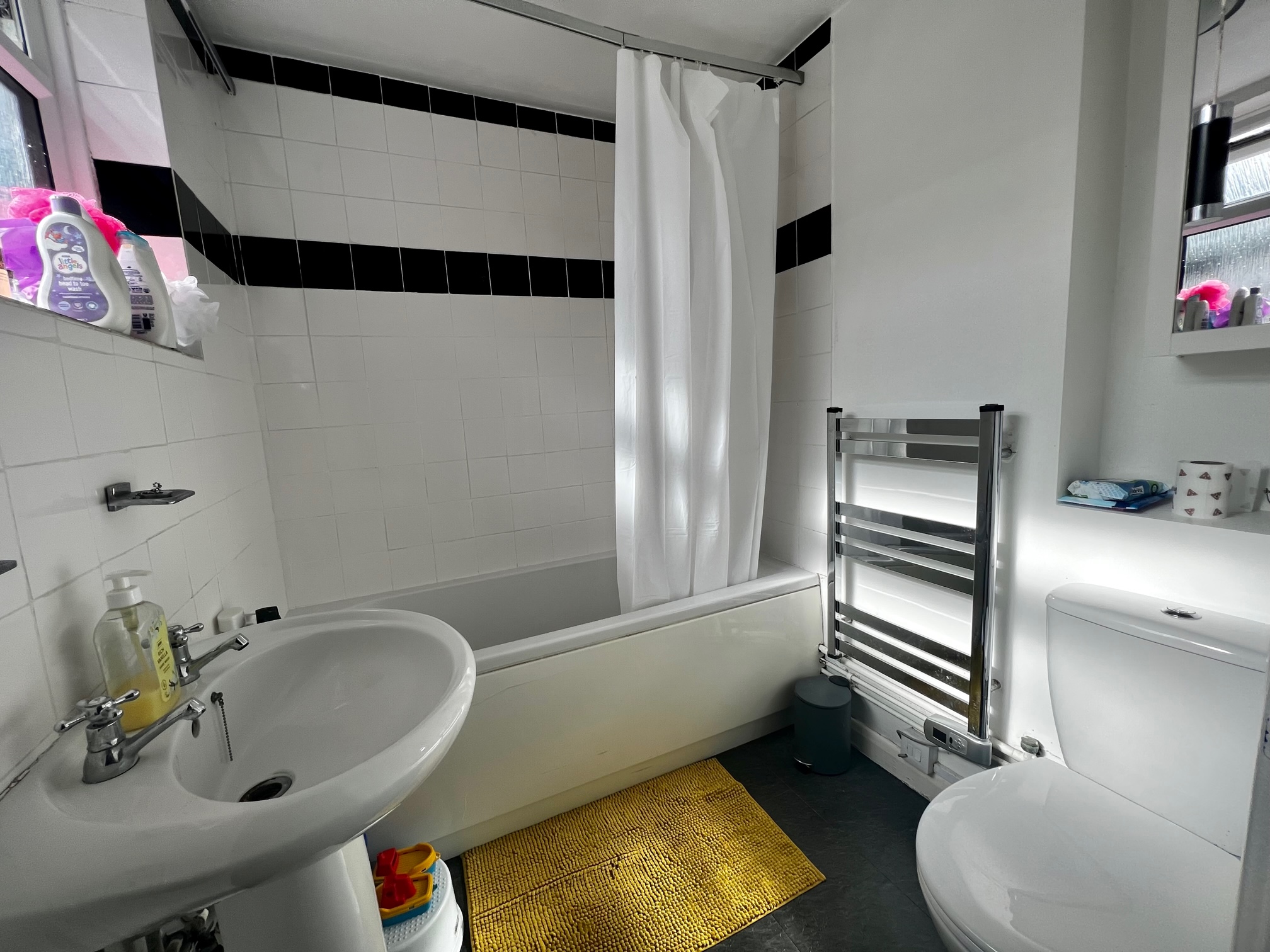 bathroom white suite comprising of bath with mixer tap, sink and pedestal, low level w/c, heated towel rail, window to rear aspect, built in storage cupboard