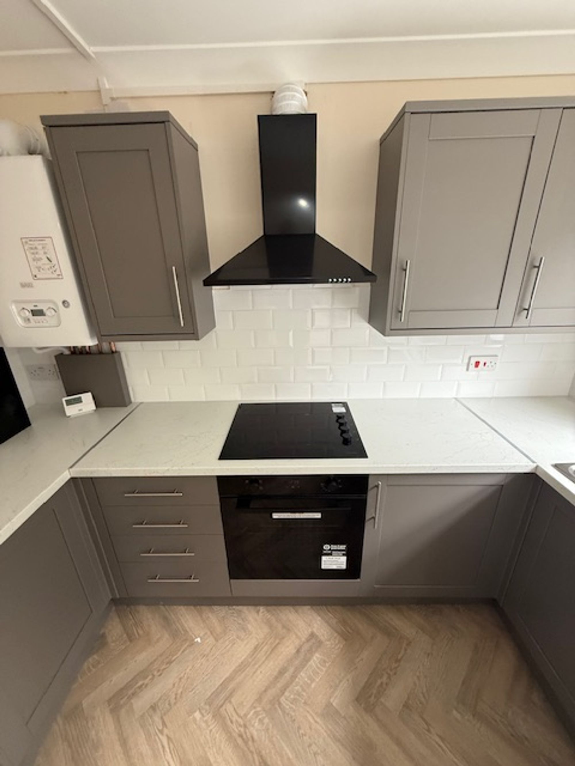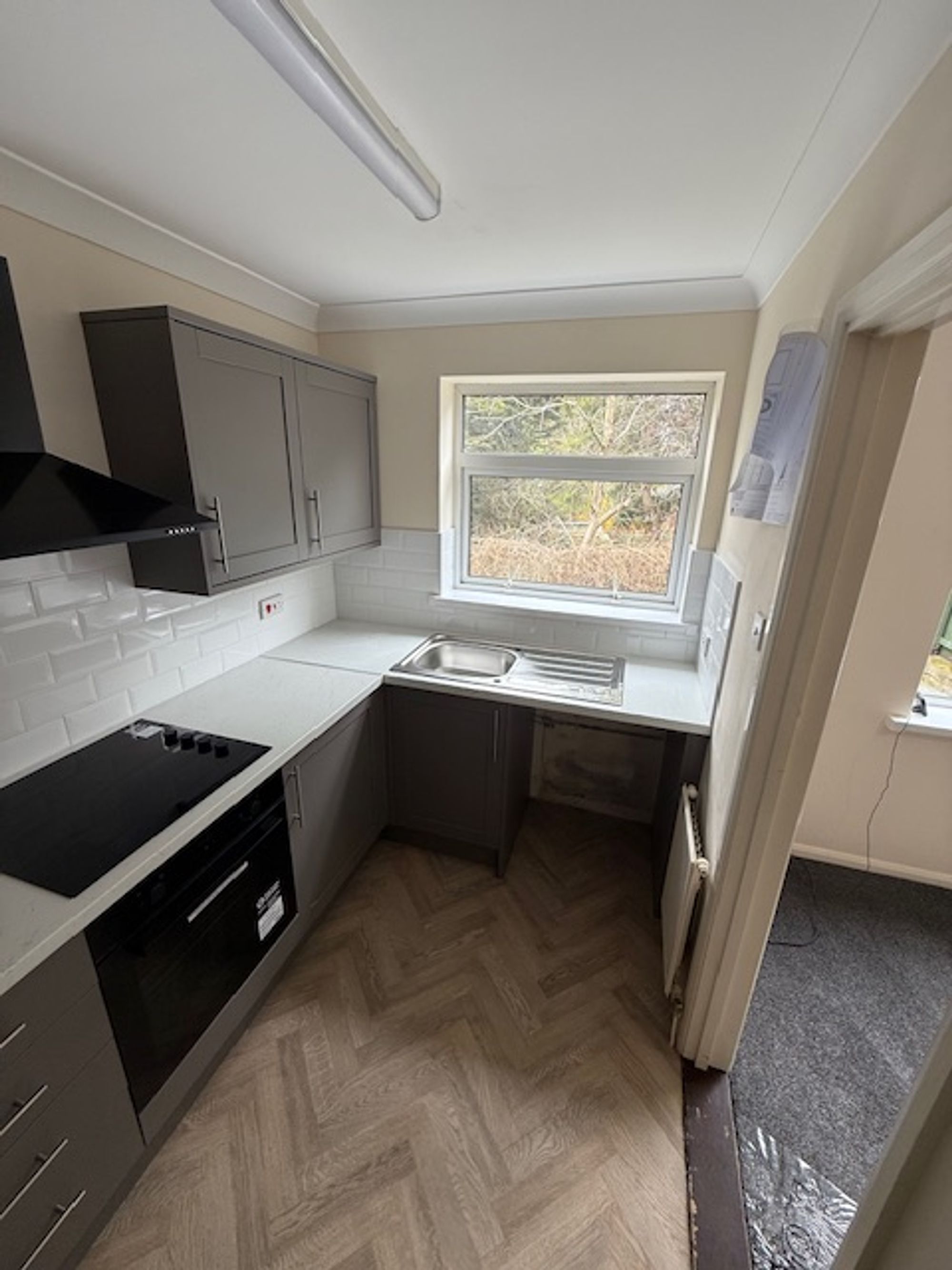 Brand new kitchen fitted with high and low low level units, brand new flooring and decor. Brand new oven and hob fitted, stainless steel sink. Double glazed window fitted with space for appliances, wall radiator