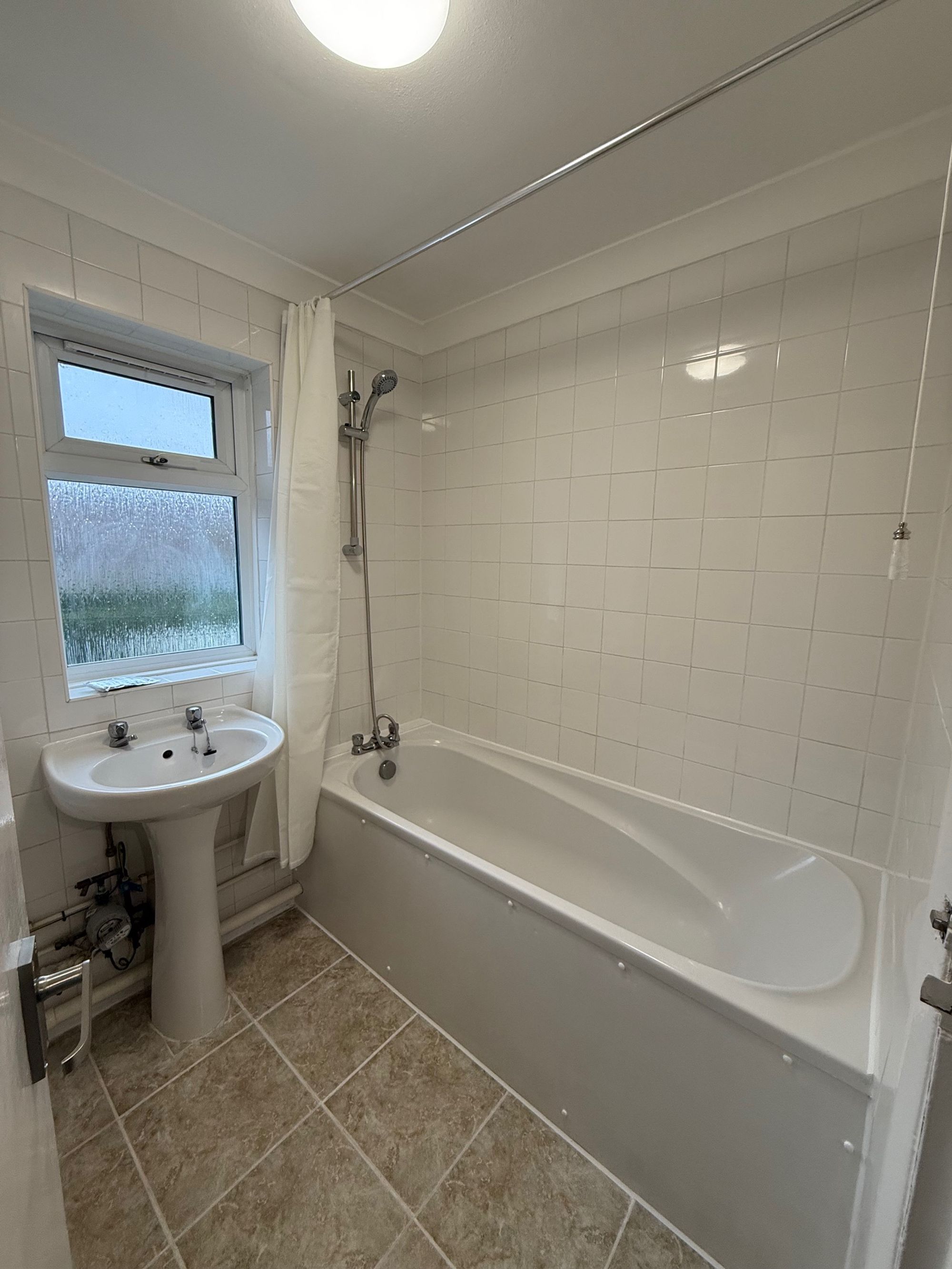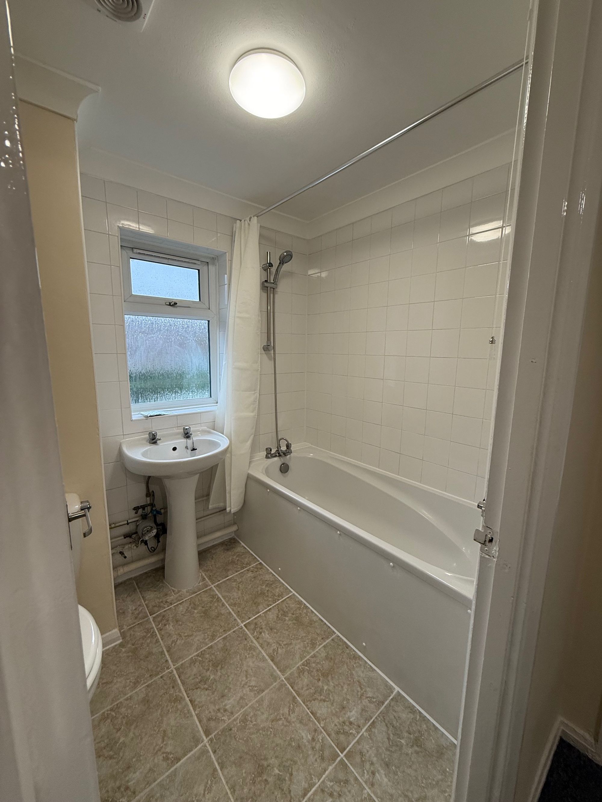 The kitchen is fitted with a range of wall and base units, stainless steel sink and drainer, double oven with hob, and space for appliances. The bathroom features a white suite comprising low level WC, wash basin and bath with shower mixer.
