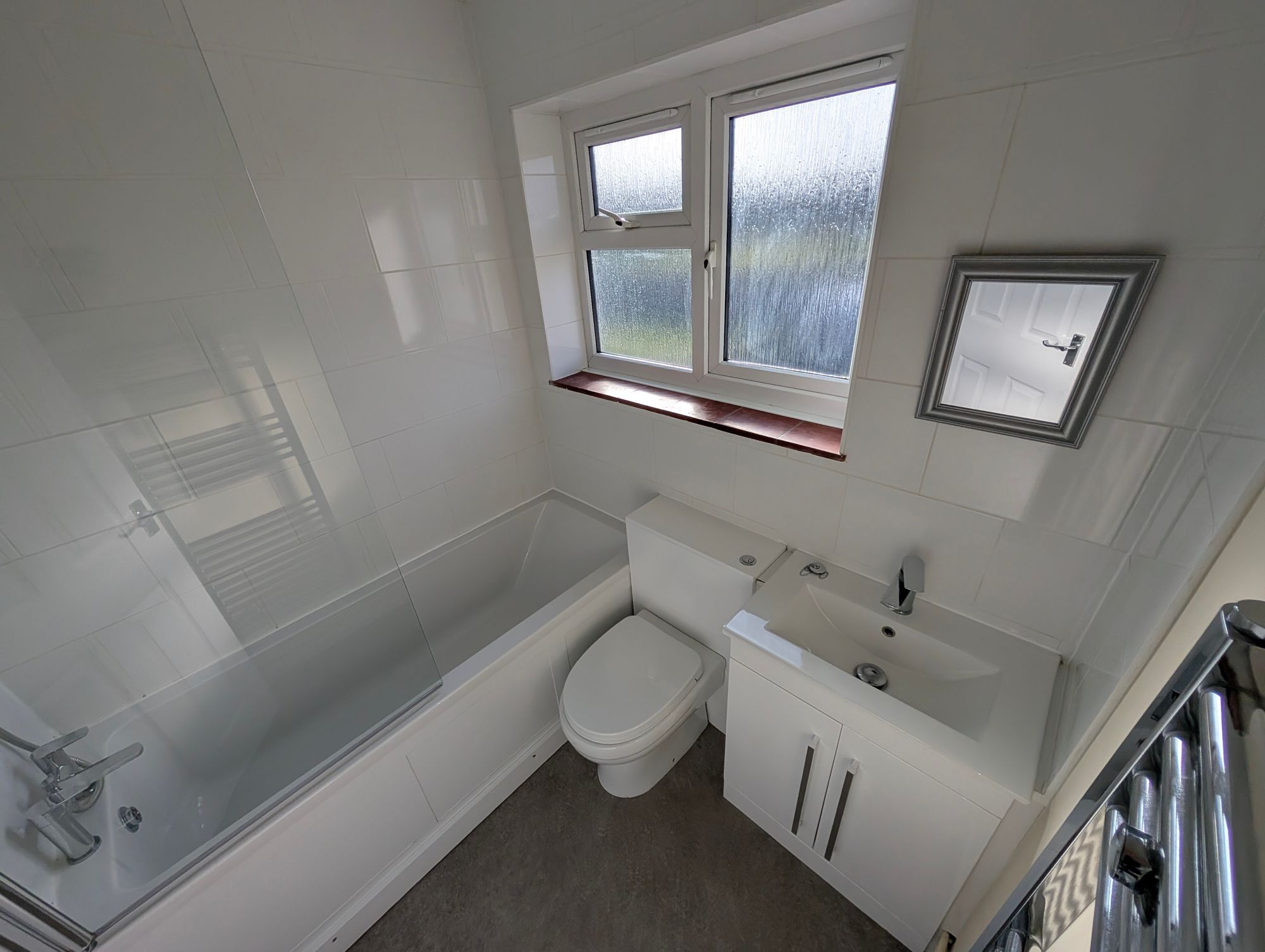 Dimensions: 6' 1" x 5' 5" (1.86m x 1.67m). Newly fitted suite, shower over the bath, towel rail.