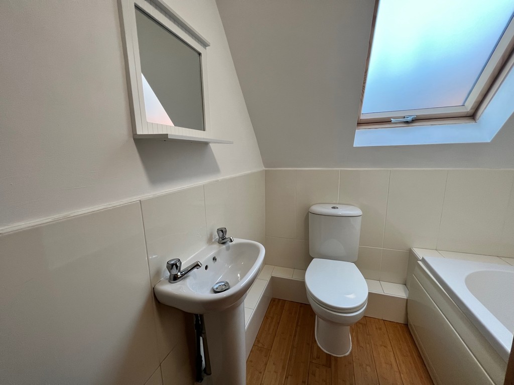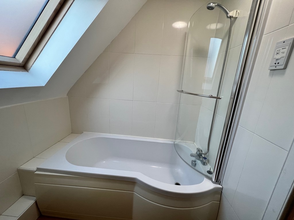 BATHROOM White fitted suite with mixer shower over bath