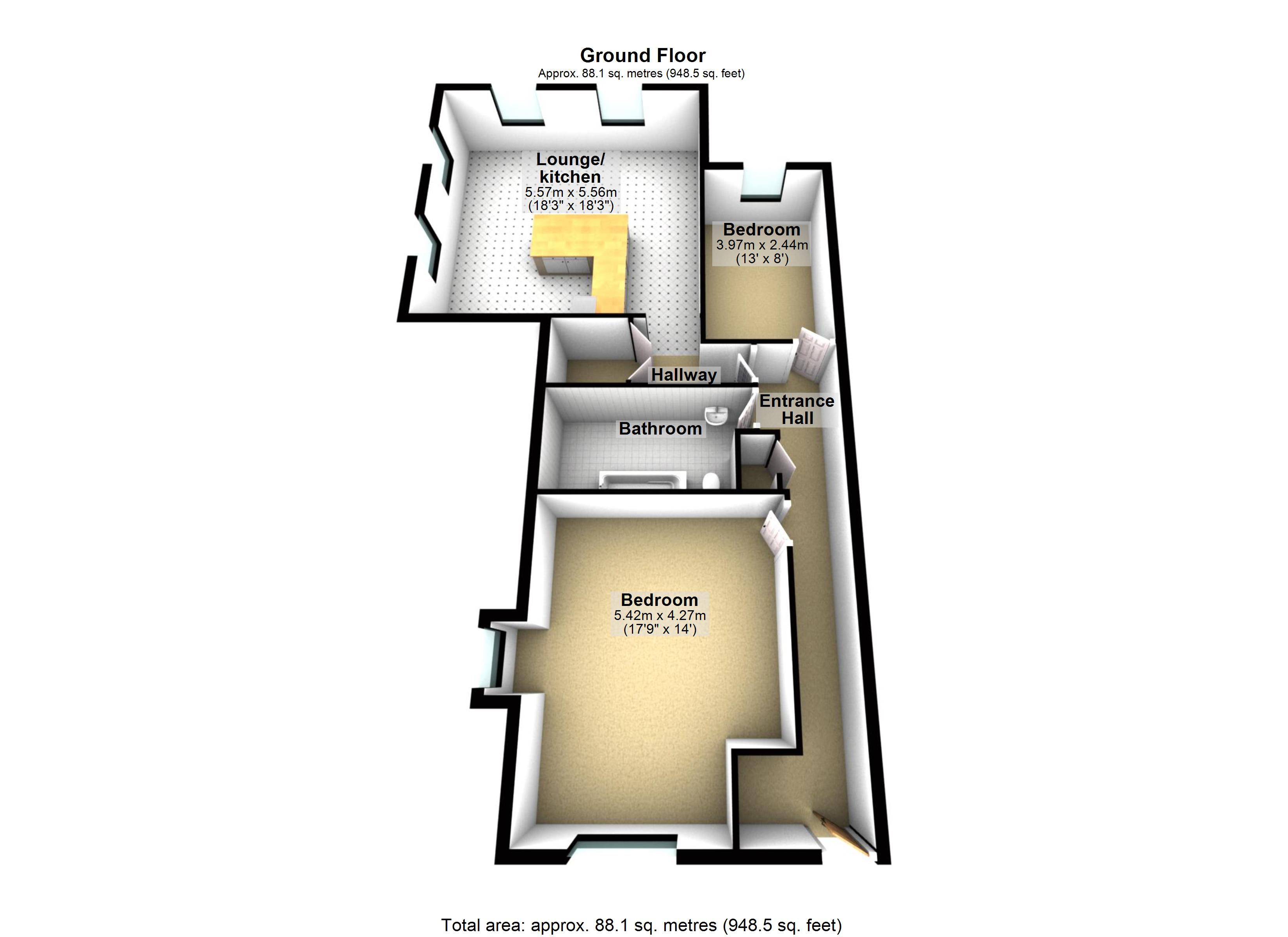 A very well presented 2 bedroom flat with LARGE rooms and an open plan Kitchen/ Living room. Outside court yard and off road parking. Sorry no pets.