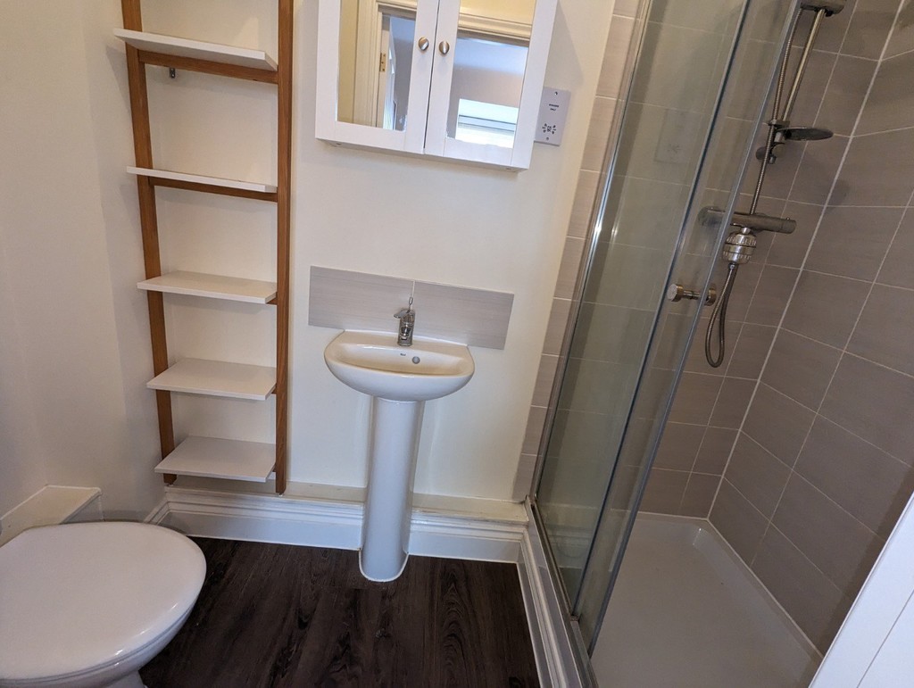 En-Suite Shower Room Built-in double shower tray with tiled surround and mains-fed shower above. Close-coupled WC and pedestal hand wash basin with tiled splashback, shaver point and cupboard above. Wall-mounted radiator and extractor fan.