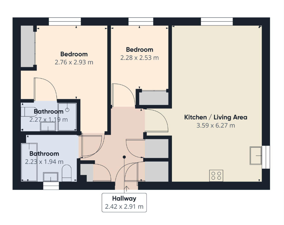 Entrance door with allocated post box. Door leading into a spacious hallway with shelved airing cupboard and two further storage cupboards, ideal for coats, shoes and household items.