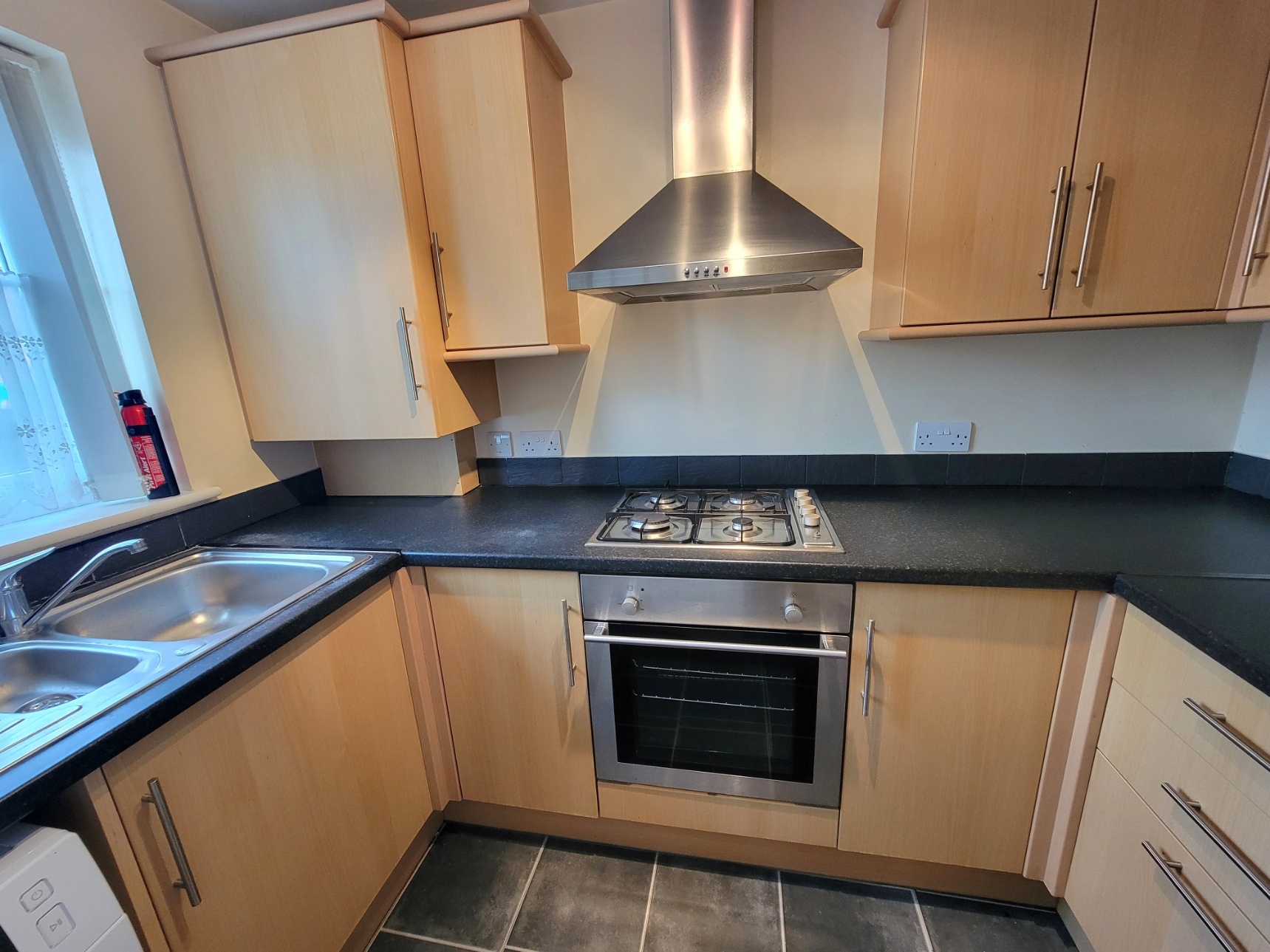 8' 9" x 6' 4" (2.67m x 1.93m) Fitted with a good range of base and wall mounted units having wood effect doors and drawer fronts, fitted worktops inset with one and a half bowl stainless steel sink unit with mixer tap, plumbing for washing machine, built-in stainless steel fan assisted oven, four ring gas hob above, stainless steel extractor connected over, integrated fridge/freezer, wall mounted gas fired combination boiler concealed within a cupboard, PVC double glazed window to the front aspect.