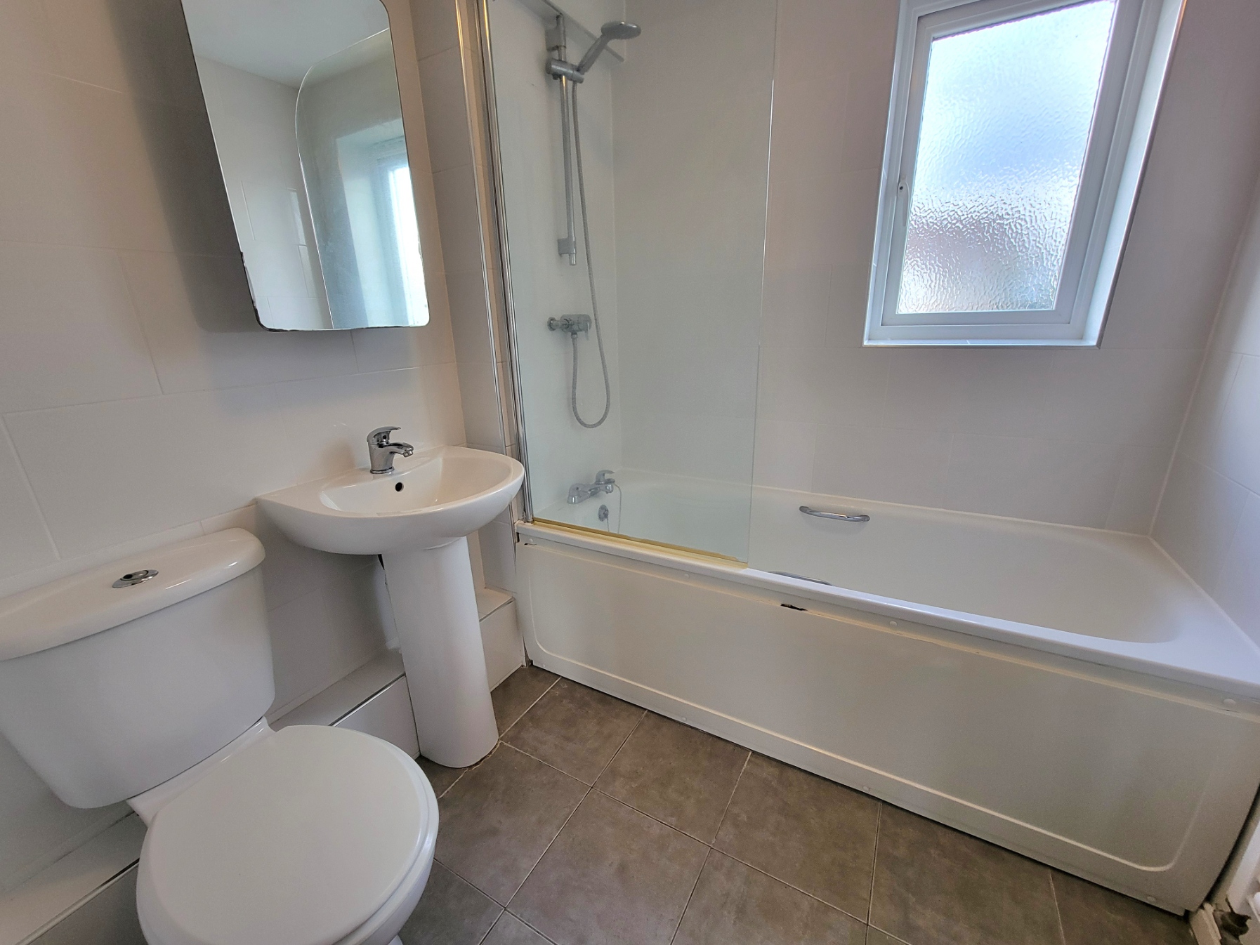 Modern white suite comprises panel bath with chrome mixer tap, separate shower connected over and pivot glazed screen, low level wc and pedestal wash hand basin, tiled floor, fully tiled walls, towel radiator, PVC double glazed window to the front aspect.