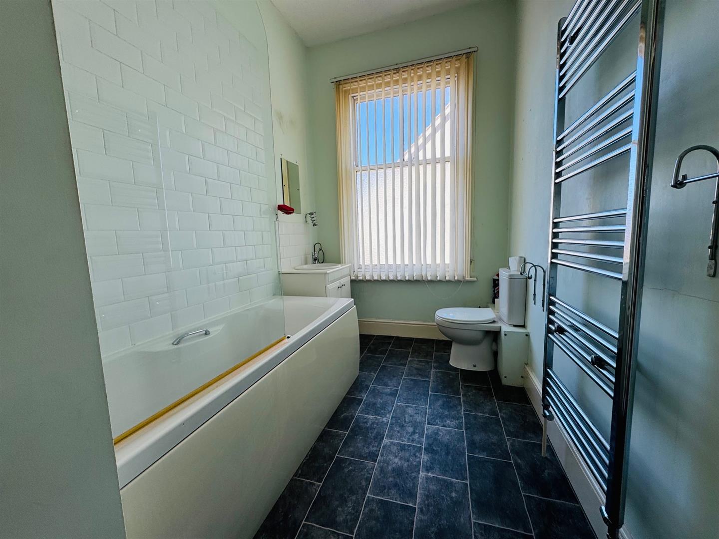 Window to side, bath with shower over, glass screen, W.C, hand wash basin and vanity unit, part tiled walls and towel radiator.