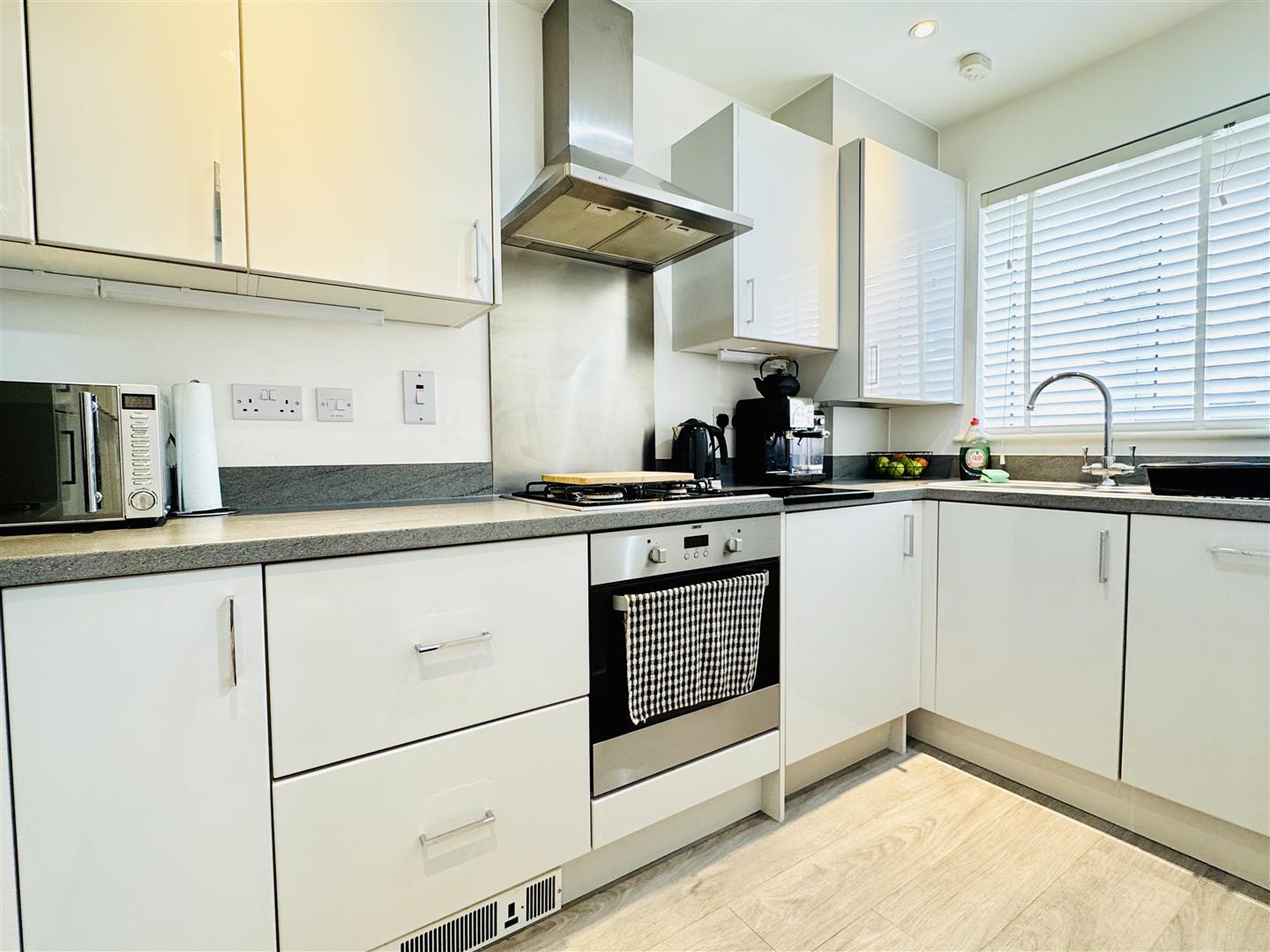 Double glazed window to front, fitted with wall and base units, integrated fridge/freezer, washing machine, dishwasher, gas hob, electric oven and extractor hood. Sink and drainer, wall unit housing come boiler and a water softener under sink.