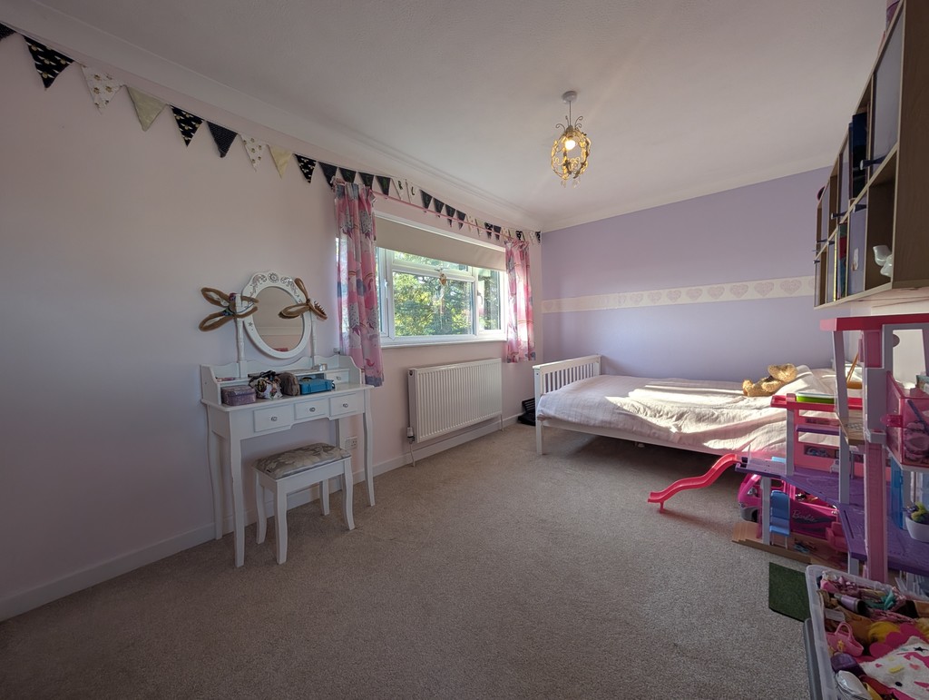 A generous double bedroom with window overlooking the rear garden and open fields beyond. Built-in storage cupboard and radiator.