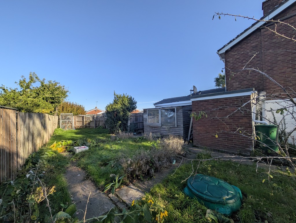 The property is approached via a private driveway providing off-road parking for up to three vehicles, leading to the integral garage. The rear garden is fully enclosed and mainly laid to lawn, with mature planting, established shrubs, and multiple seating areas perfect for outdoor entertaining. From the first floor, there are attractive views over open fields to the rear. A timber storage shed is included.