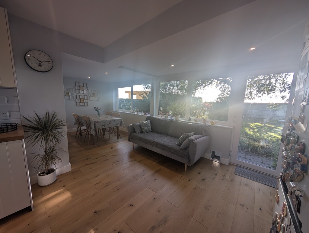 A bright and spacious dual-aspect room, ideal for entertaining or family life. The kitchen is fitted with a range of high and low-level cabinets and solid wood work surfaces, complemented by tiled splashbacks. Appliances include an integrated electric oven and hob with extractor hood, plus space for a washing machine, dishwasher, and tall fridge-freezer. The room is finished with spotlights, a radiator, and engineered wood flooring, while a glazed rear door opens to the garden.