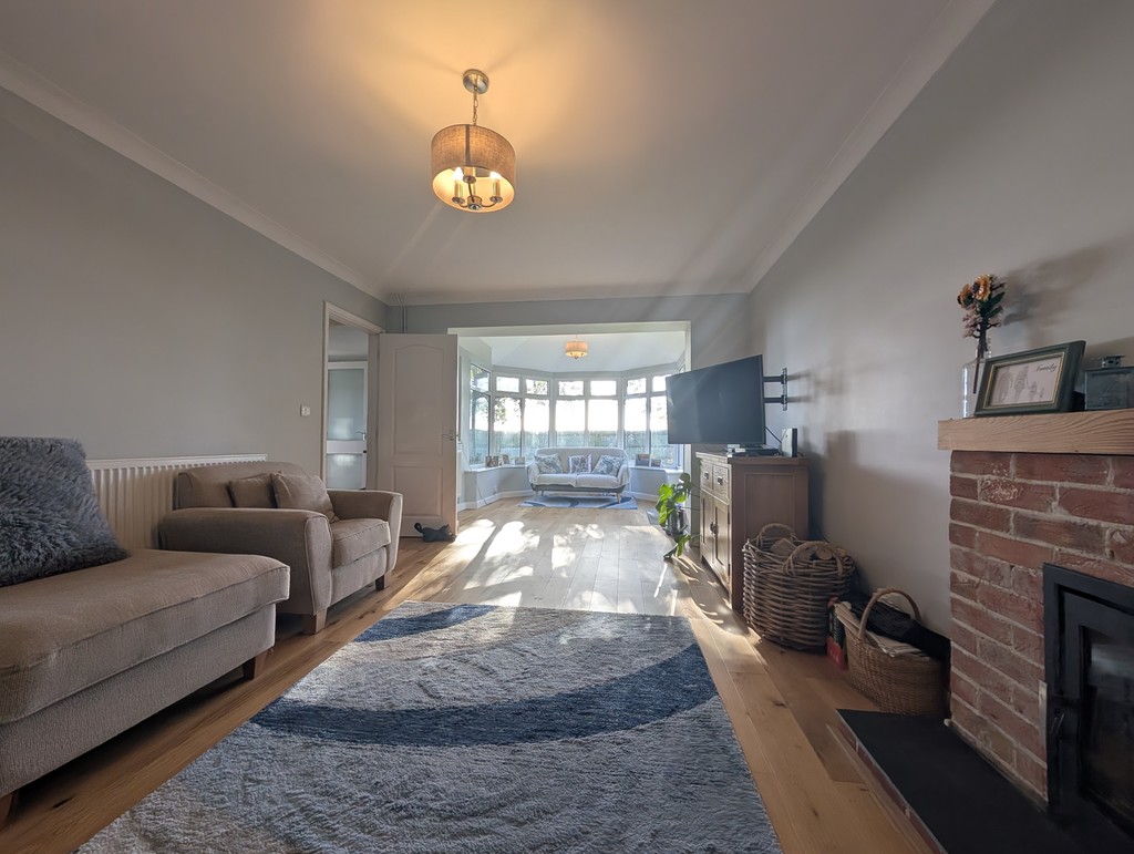 A beautifully presented sitting room featuring a brick fireplace with wooden mantel, tiled hearth, and inset wood-burning stove. Glazed windows overlook the rear garden, and double doors open onto the patio. Radiator and engineered wood flooring complete this warm and welcoming room.