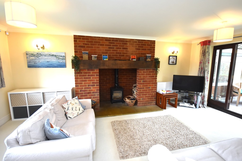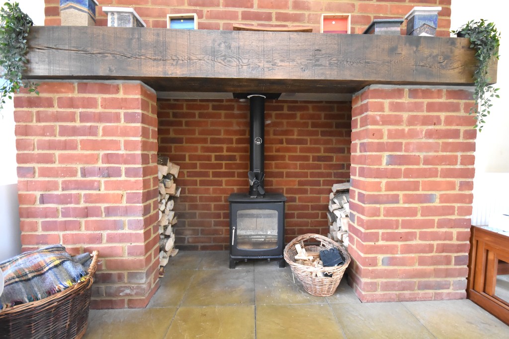 featuring an attractive wood-burning stove as its focal point. A double glazed window overlooks the front aspect, while double glazed doors open into the conservatory