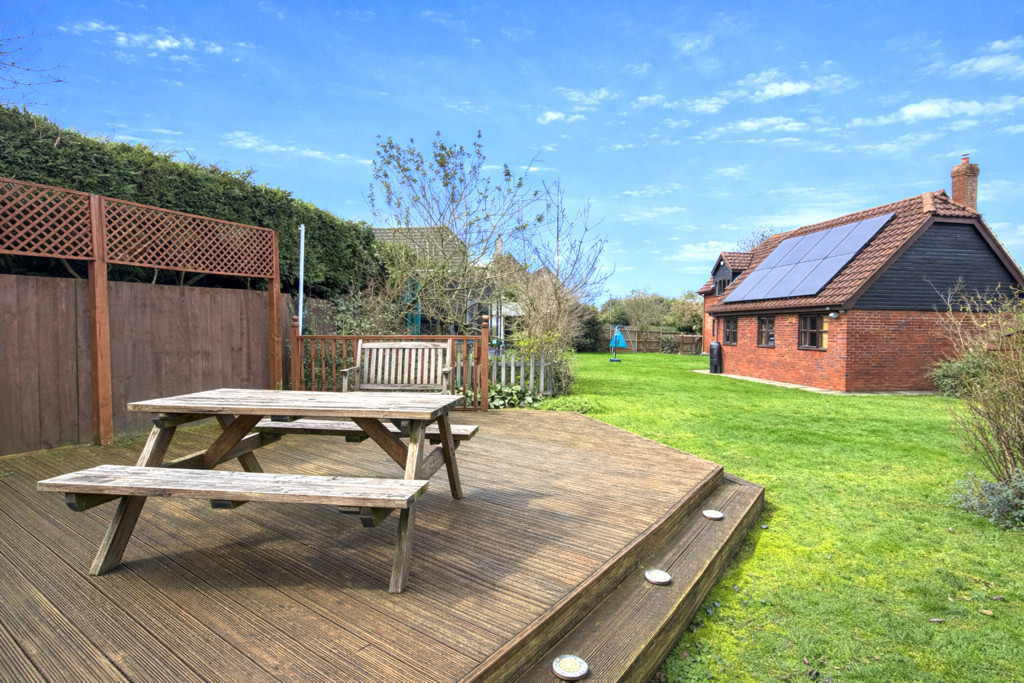To the rear, a generously proportioned, fully enclosed garden is predominantly laid to lawn. A raised decked terrace provides the perfect setting for outdoor entertaining, all while enjoying uninterrupted views across open fields.