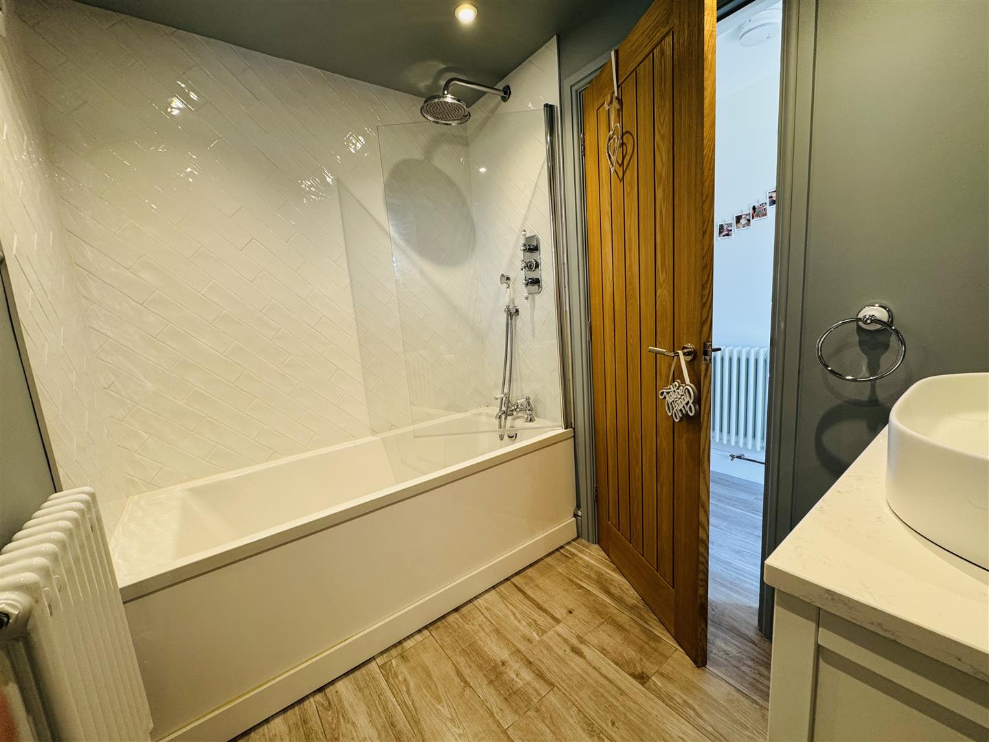 Double glazed window to front, modern suite comprising of a bath with shower over, glass screen, hand wash basin with stylish wall mounted taps and a vanity unit, W.C and a radiator.