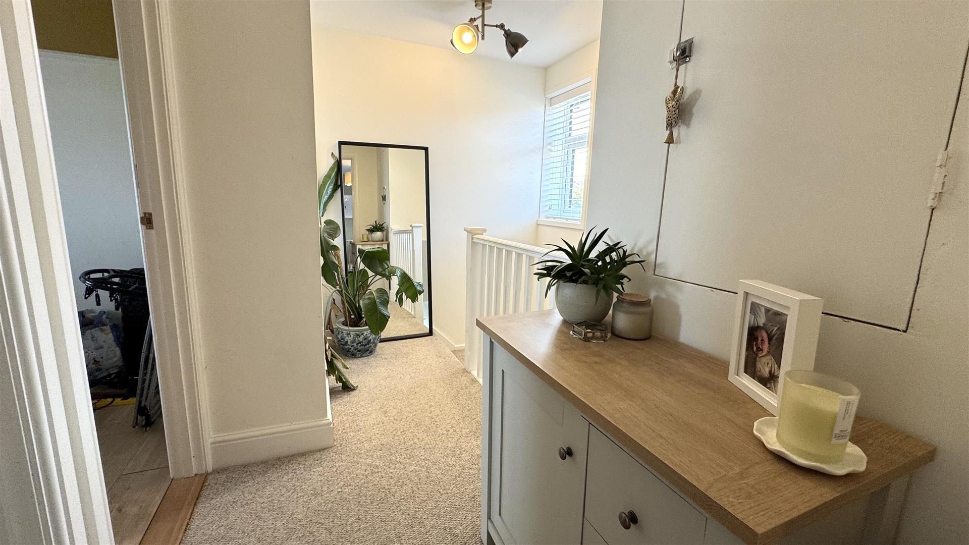 Loft access with a Baxi combi boiler fitted 2019. There is storage cupboard, carpet and doors off. Double glazed window to front.