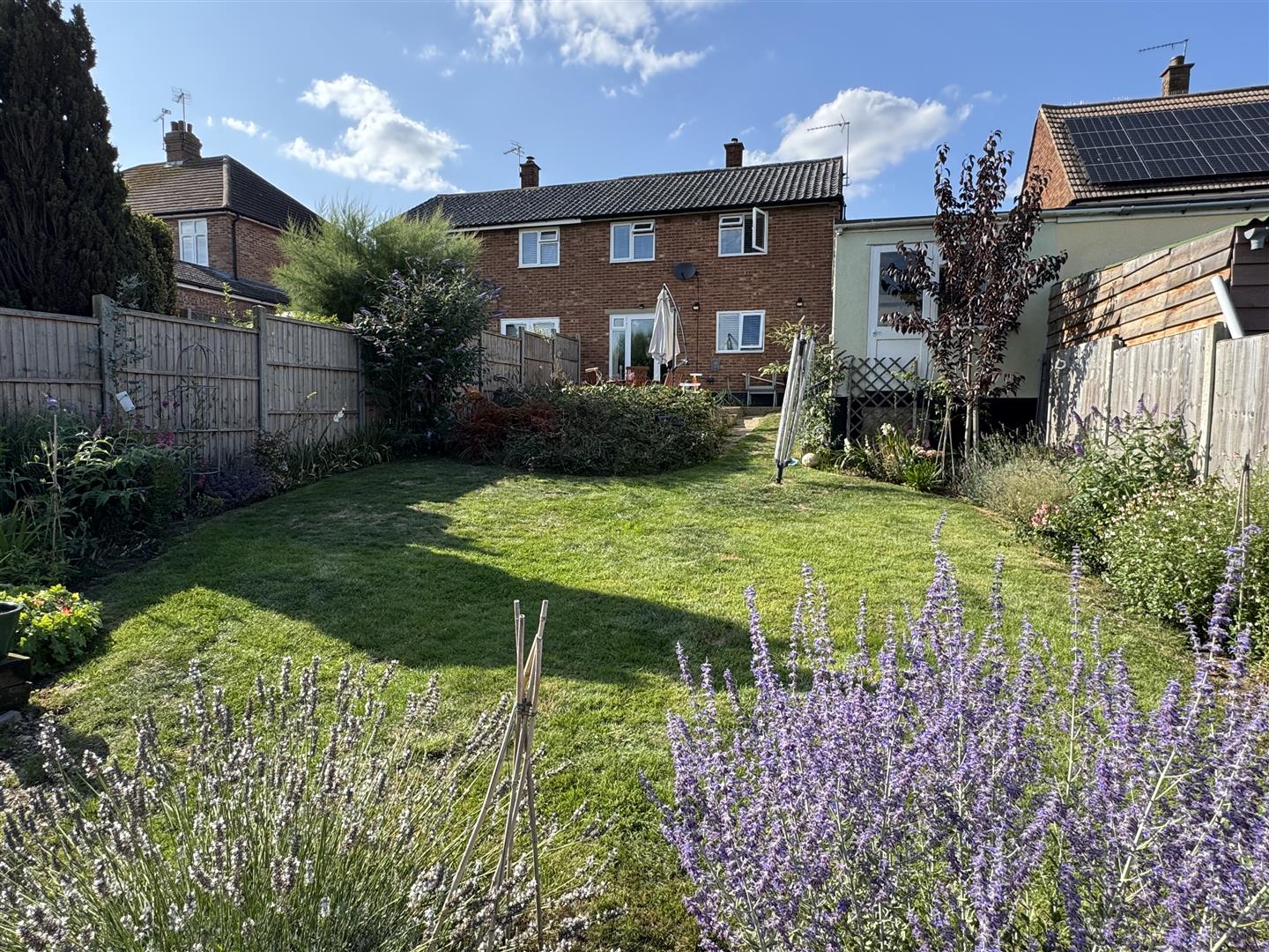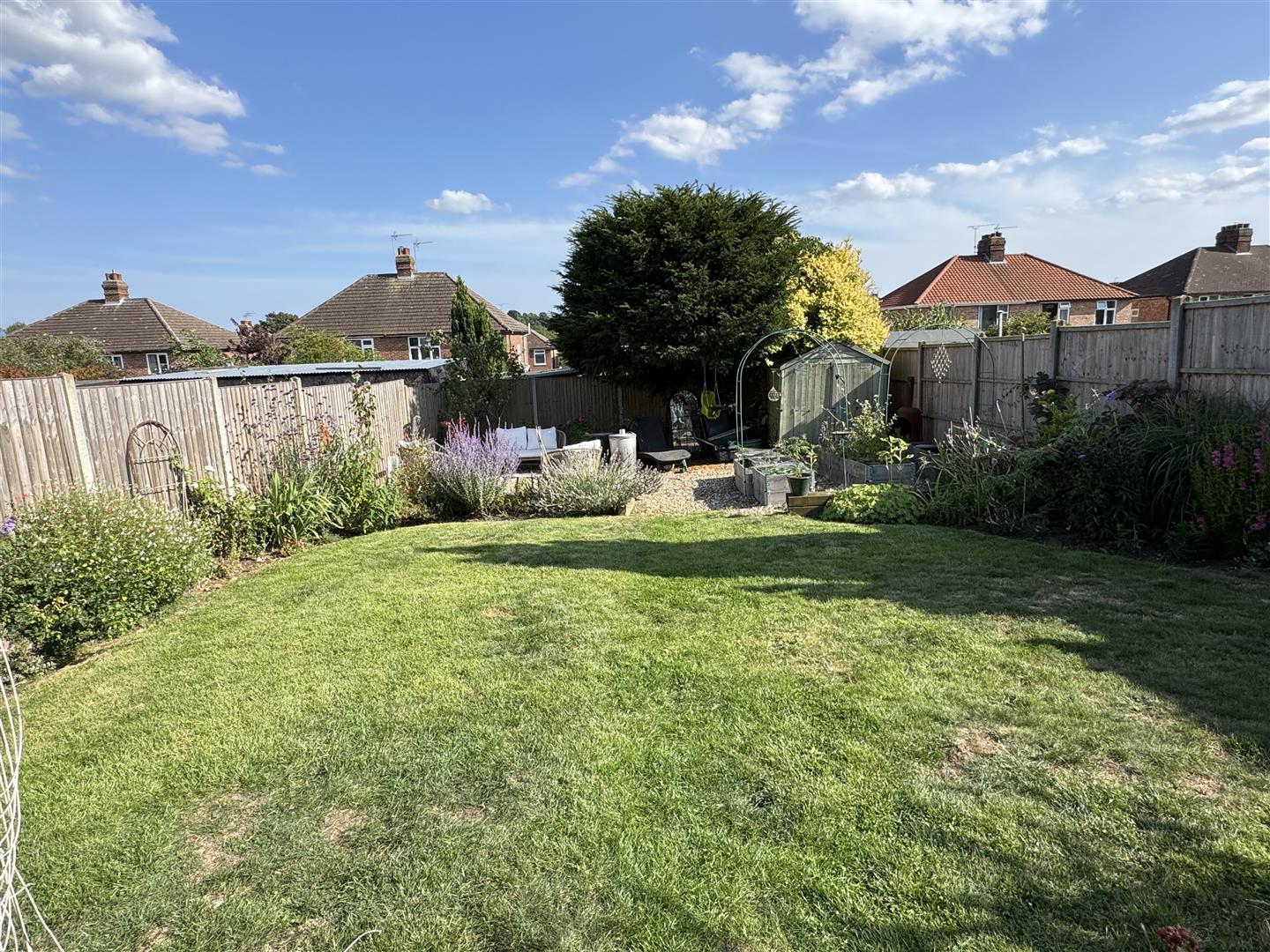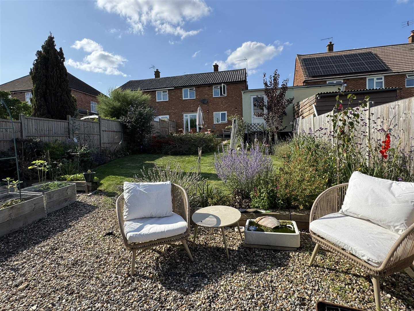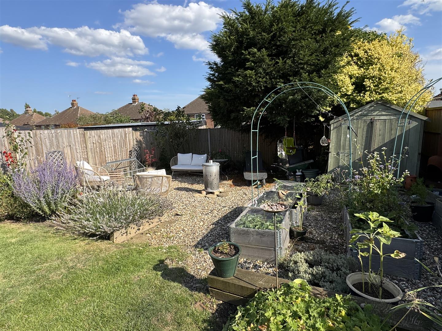 The south easterly facing garden has a lawn, patio, shingle area, flower beddings and a shed.