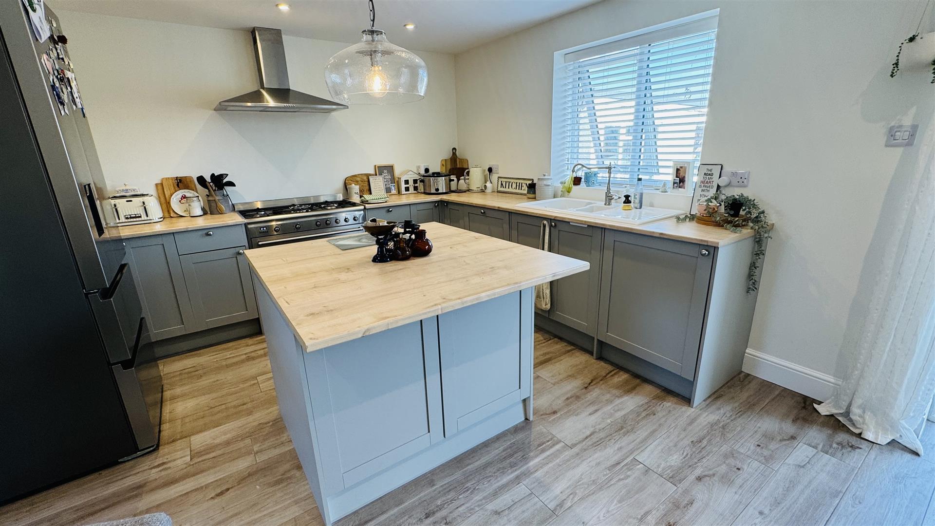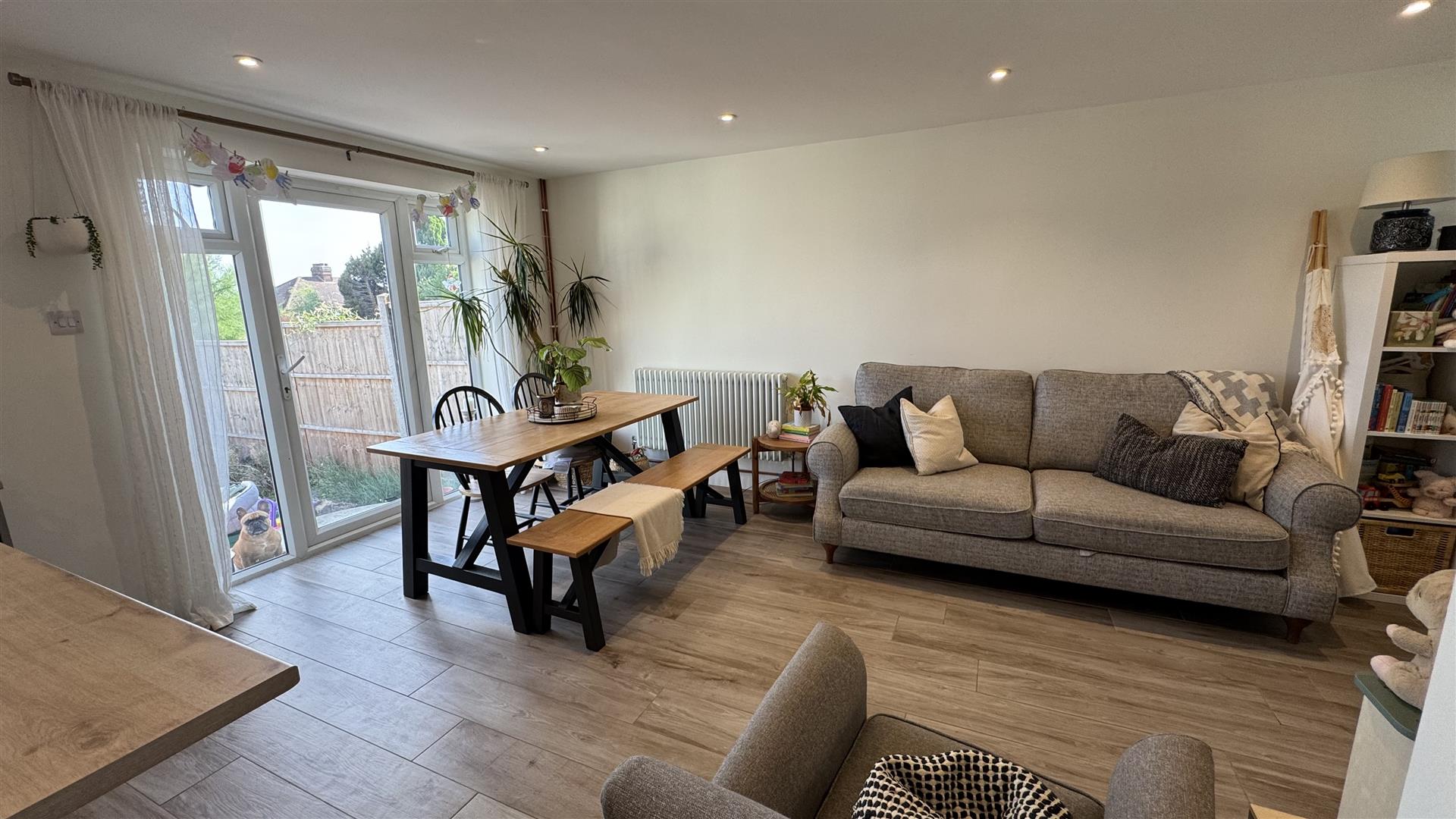 This modern open plan living space enjoys double glazed door to the rear garden, cupboard under stairs, tiled floor and radiators. The kitchen has wall and base units, integrated dishwasher and washing machine, space for range style cooker and fridge, worktops, sink and drainer, central island/breakfast bar with units under, spot lighting and a double glazed window to rear.