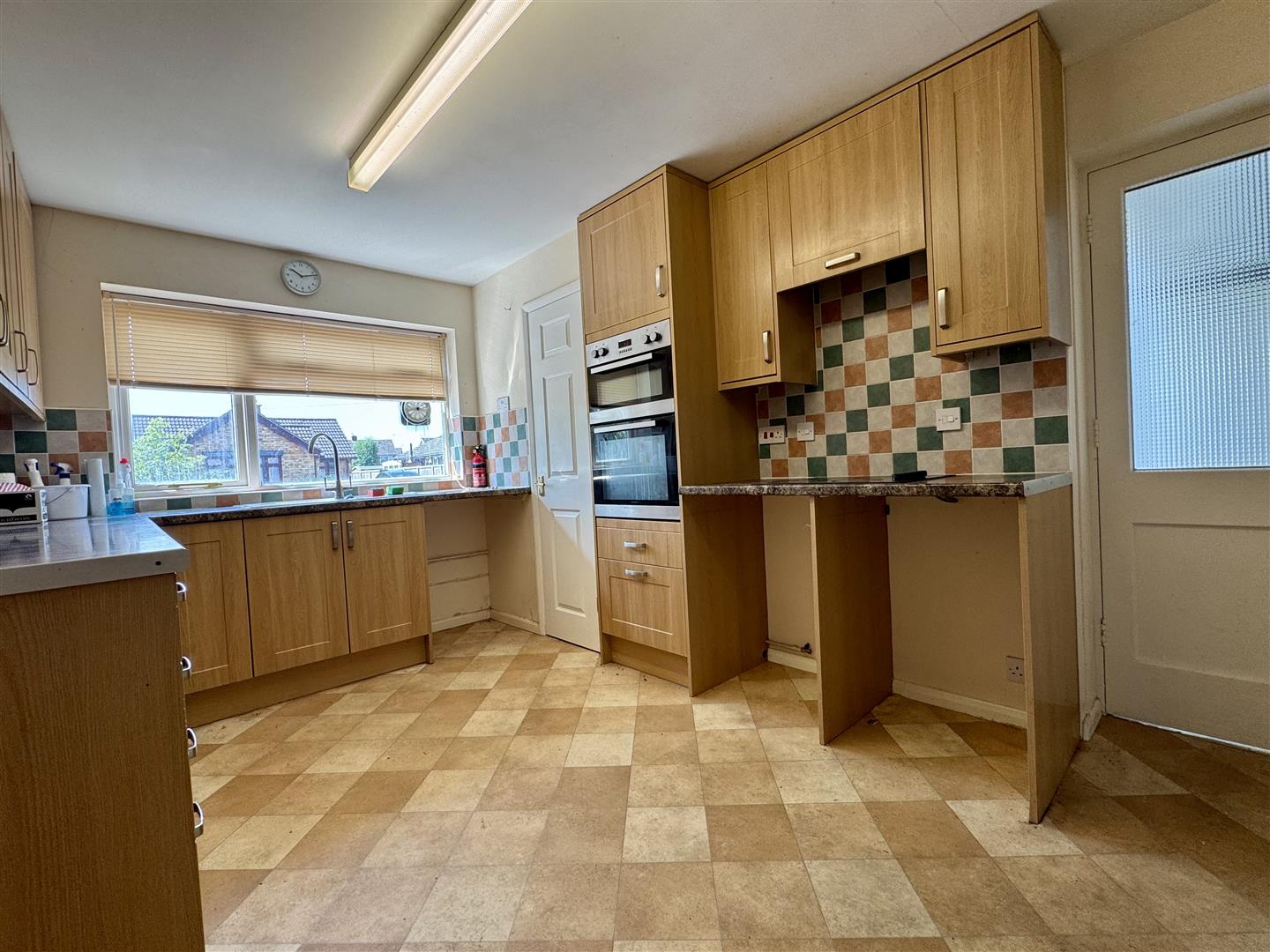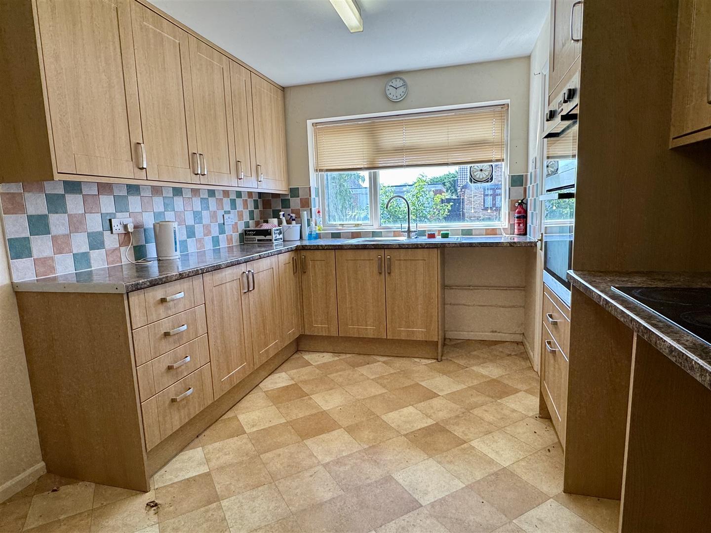 Double glazed window to front, range of wall and base units, sink and drainer, drawers, electric hob and double oven, space for appliances.