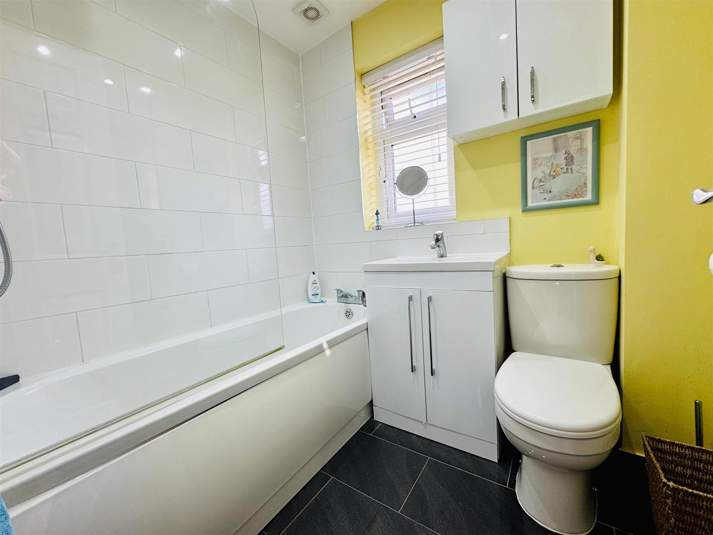 Double glazed window to rear, bath with shower over, W.C, hand wash basin, tiled floor and a towel radiator.