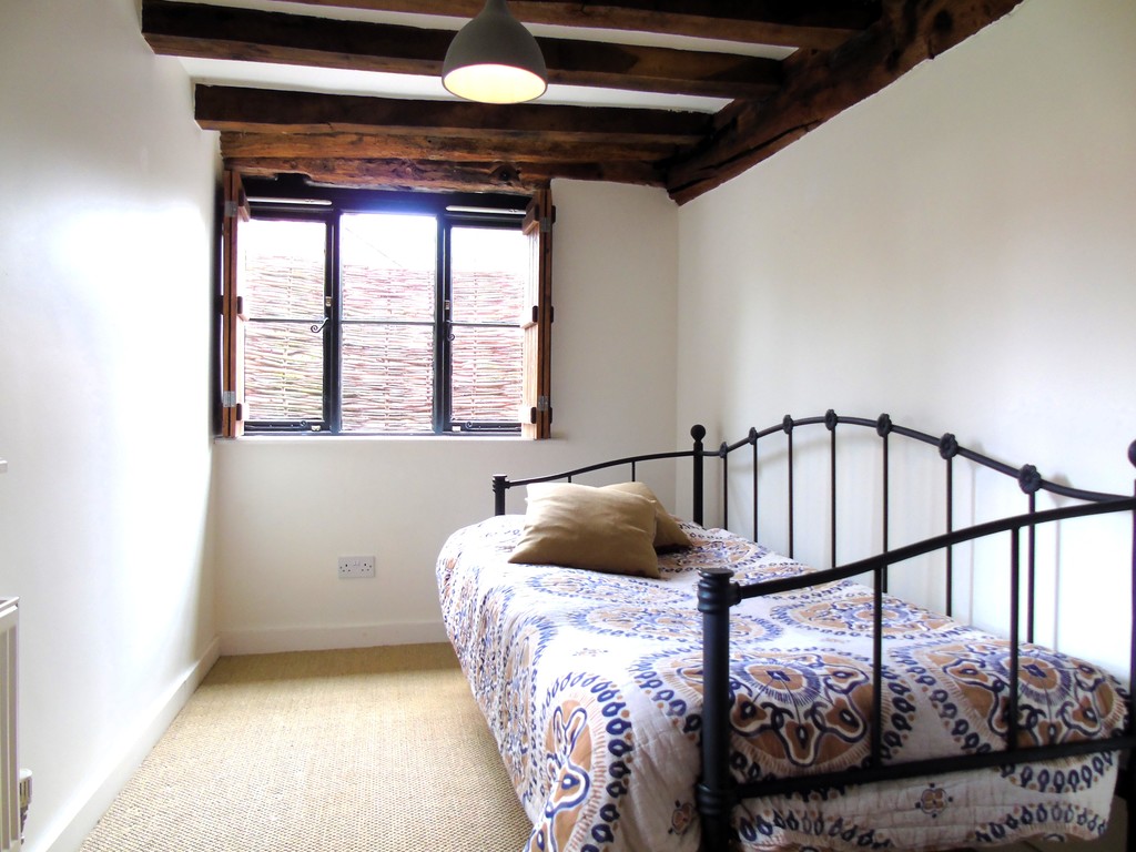 A versatile third bedroom with exposed timbers, windows to both the front and side aspects, and a wall radiator.