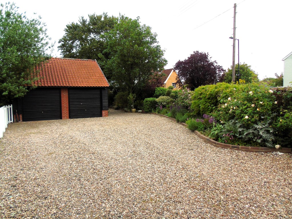 Accessed via a five-bar gate, the property enjoys a private gravel driveway providing ample off-road parking, along with a single garage equipped with power and lighting. The enclosed garden is predominantly laid to lawn, bordered by brick-edged flower beds and enhanced by a variety of established shrubs and mature trees, creating a peaceful and private outdoor setting.