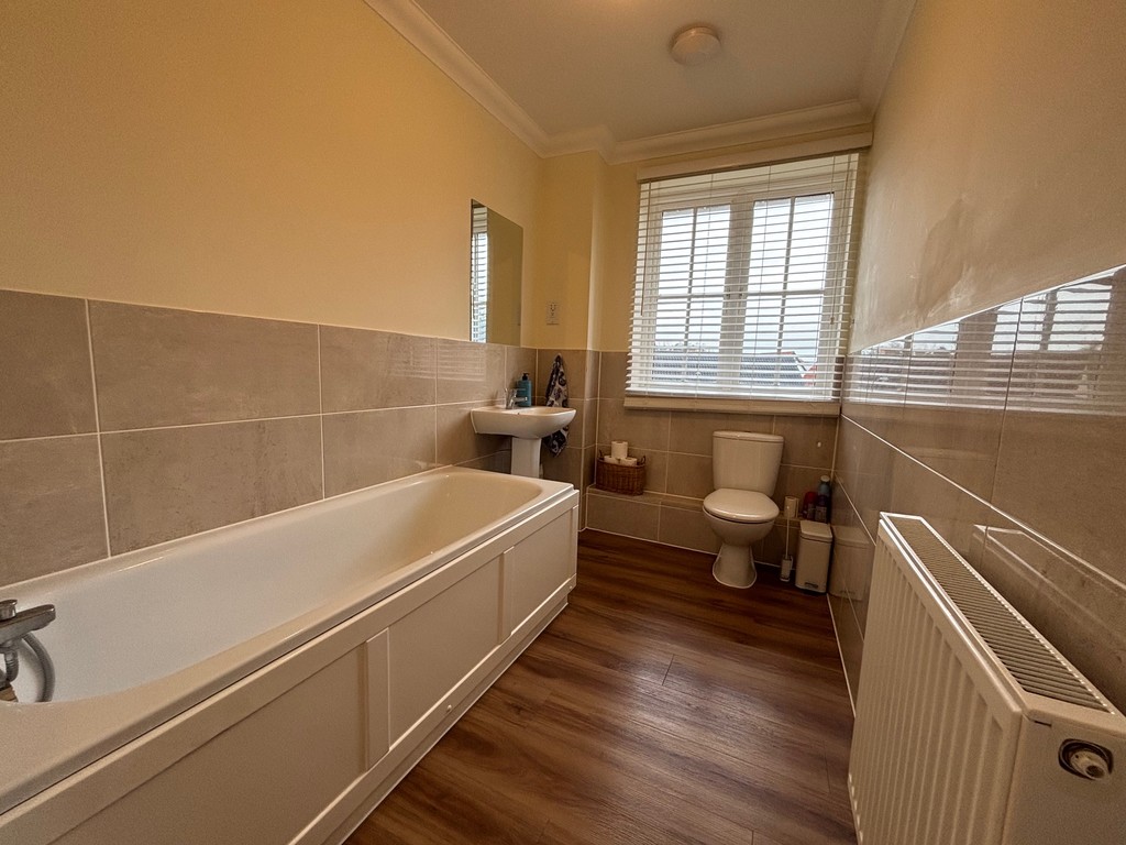 Three-piece suite comprising panel-enclosed bath with shower attachment, low-level WC, and pedestal hand wash basin. Additional features include a radiator, part-tiled walls, and a double-glazed window to the rear aspect.
