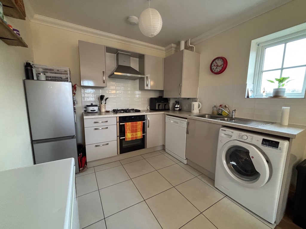 The kitchen area is fitted with a range of modern eye- and base-level units with roll-edge work surfaces, inset stainless steel sink and drainer, and tiled splashbacks. Integrated appliances include a double oven and gas hob with extractor hood over, with space provided for a fridge freezer, washing machine, and dishwasher. Finished with tiled flooring and a double-glazed window to the rear aspect.