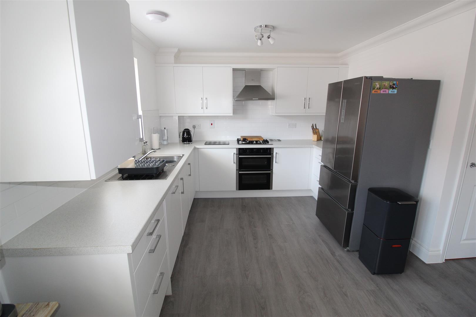 Two windows to rear, radiator, range of wall and base units, stainless steel sink with mixer tap, built in gas hob with extractor over, built in dishwasher and space for American style fridge/freezer.