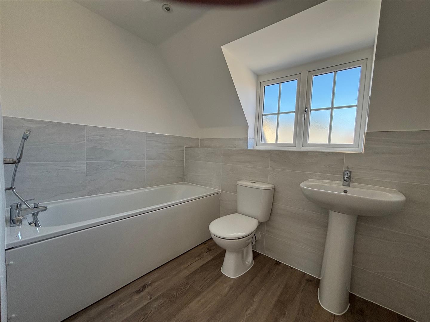 Window to front, bath, low level W/C, pedestal wash hand basin, radiator and cupboard housing boiler.