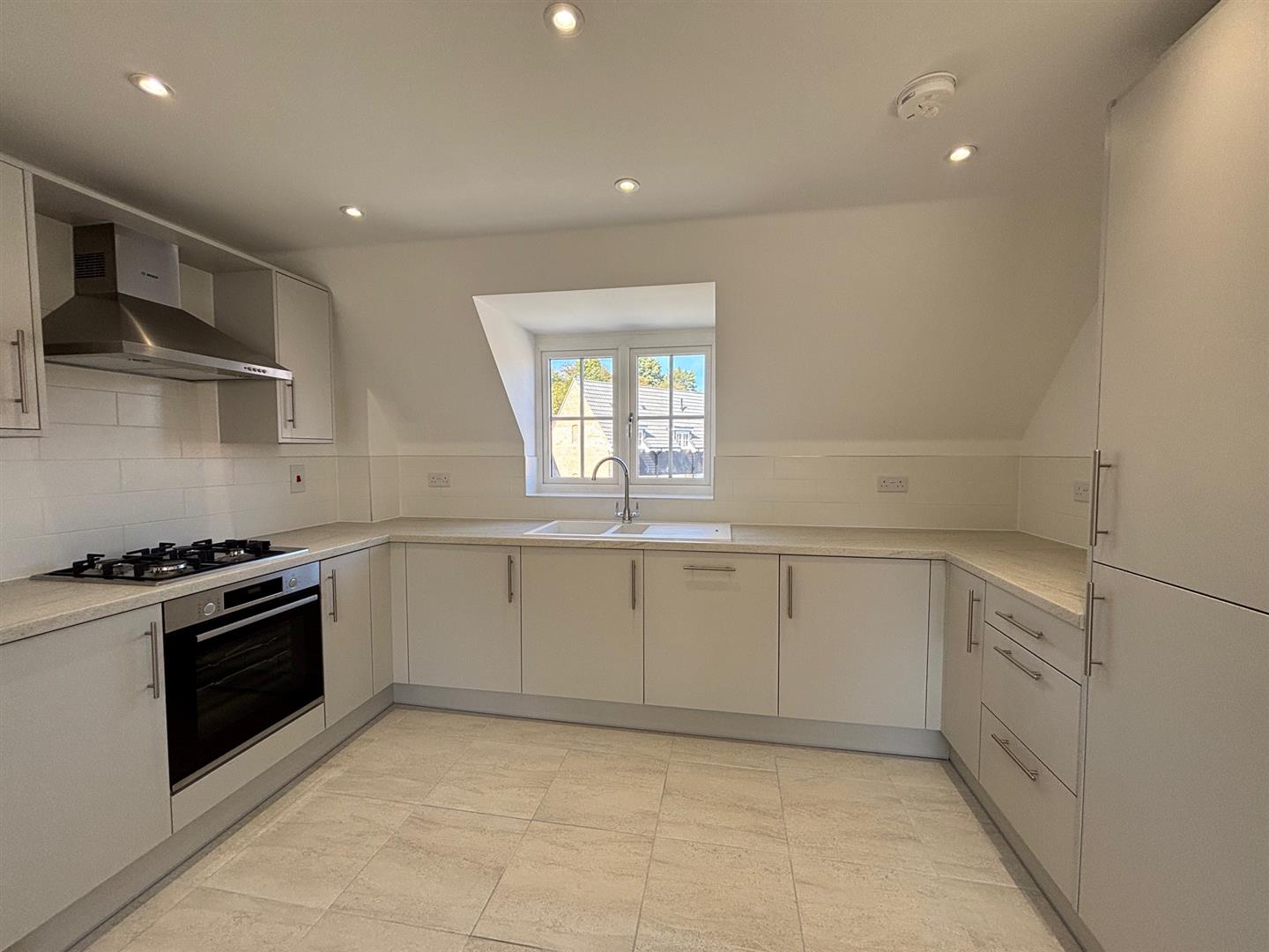 The kitchen area comprises of window to front, range of wall and base units with work surfaces over and tiled splash backs. Built in gas hob and electric oven, dishwasher, washing machine and fridge/freezer. Tiled floor and ceiling spotlights.