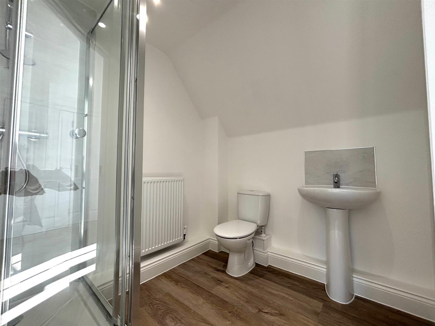 Pedestal wash hand basin, low level W/C, radiator, shower cubicle and radiator.