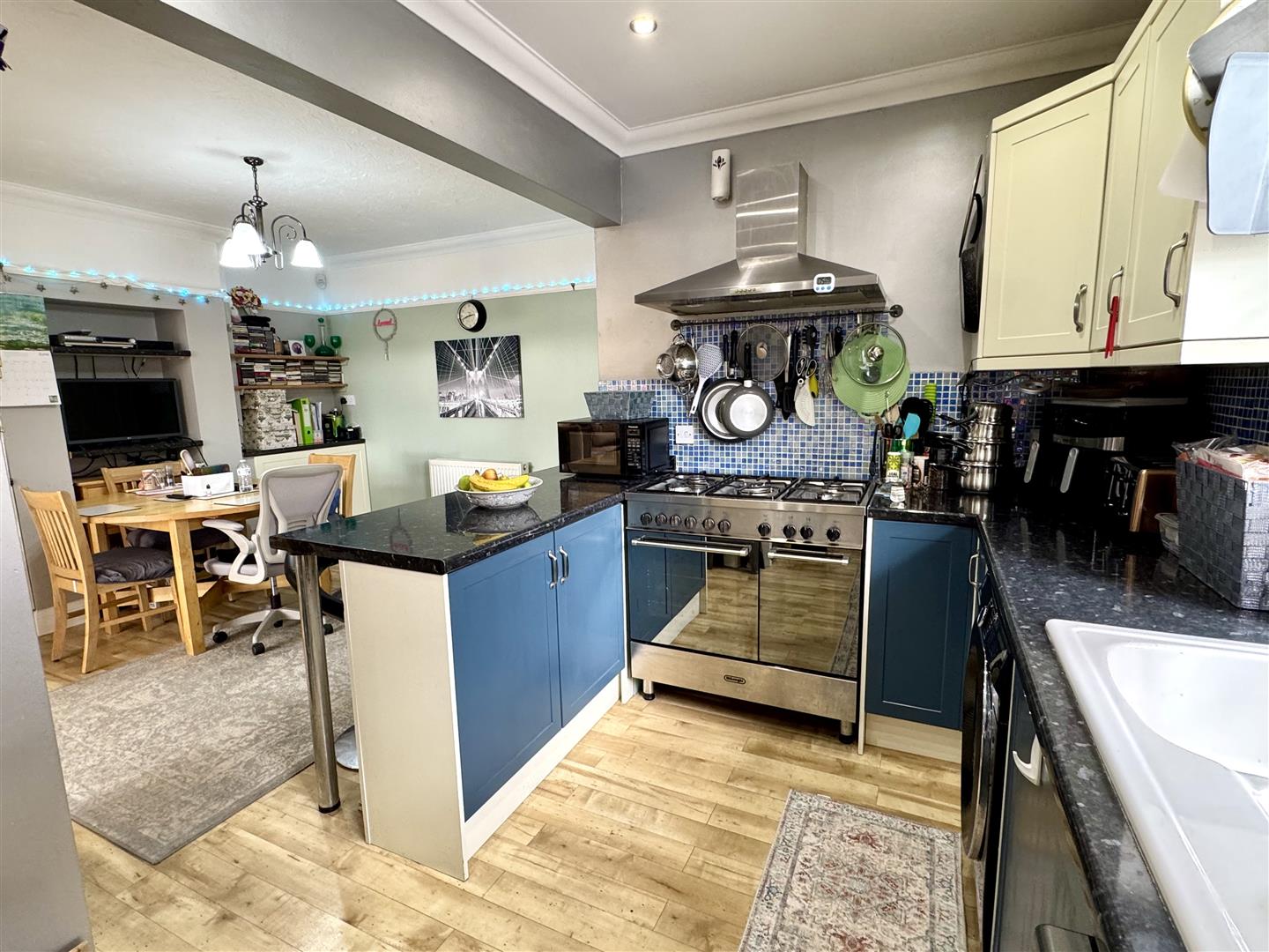 KITCHEN: Double glazed window to side, range of wall and base units, sink and drainer, tiled splash backs, space for appliances, space for a range style cooker, work surfaces and units under. Door to cloakroom.