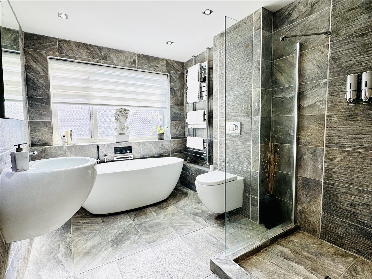 Beautiful bathroom suite comprising of tiled walls and flooring, walk in shower with glass screen with waterfall shower, wall hung WC, wall hung hand wash basin, freestanding bath, towel radiator, spot lighting and extractor fan.