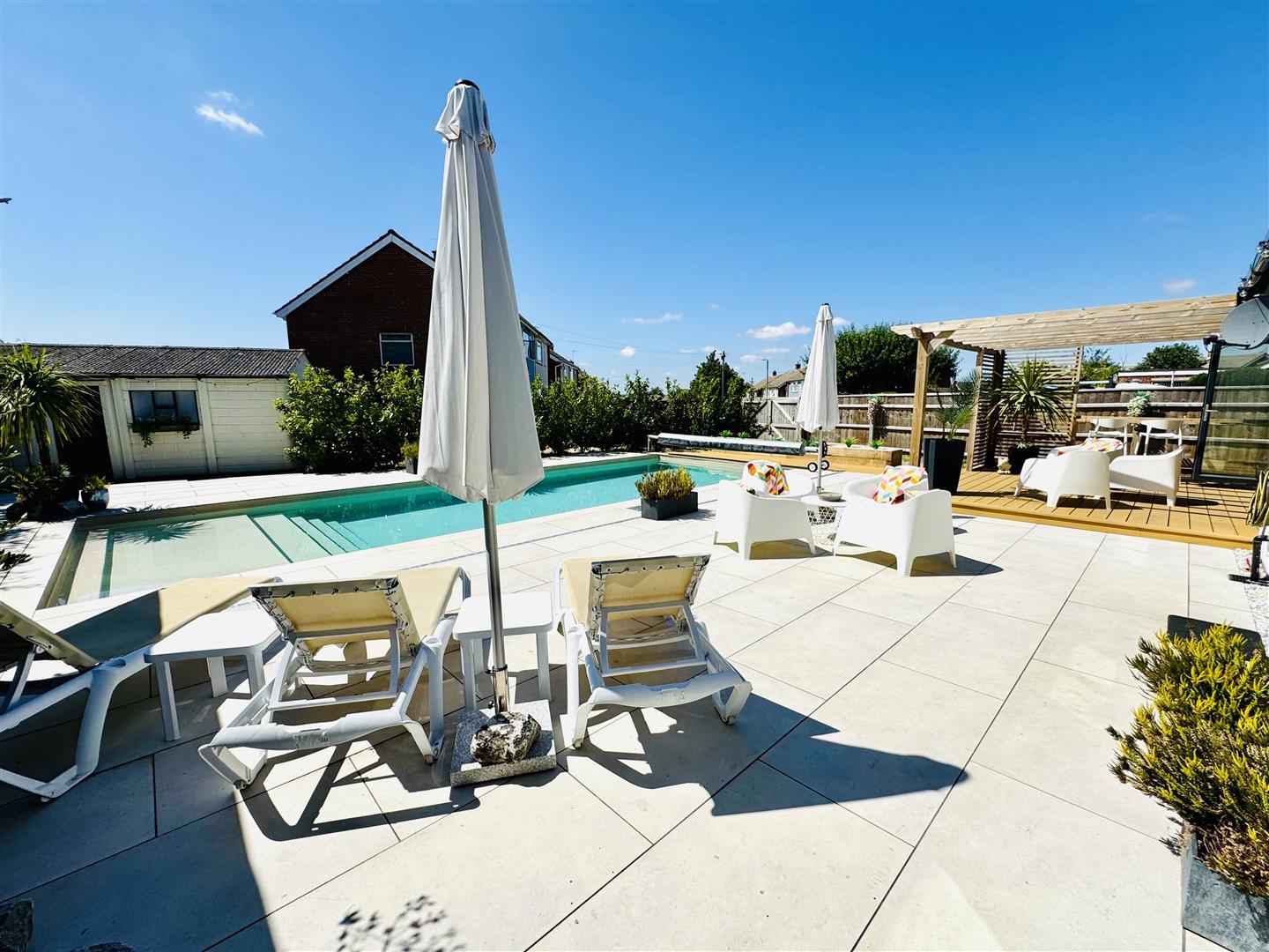 The rear garden is a swimming pool paradise boasting a 35 ft heated pool surrounded by a Porcelain R11 grade non slip patio, a decking area and pergola with access to the lounge, The enclosed garden has Laurel hedging and a 2nd pergola with slatted paneling.