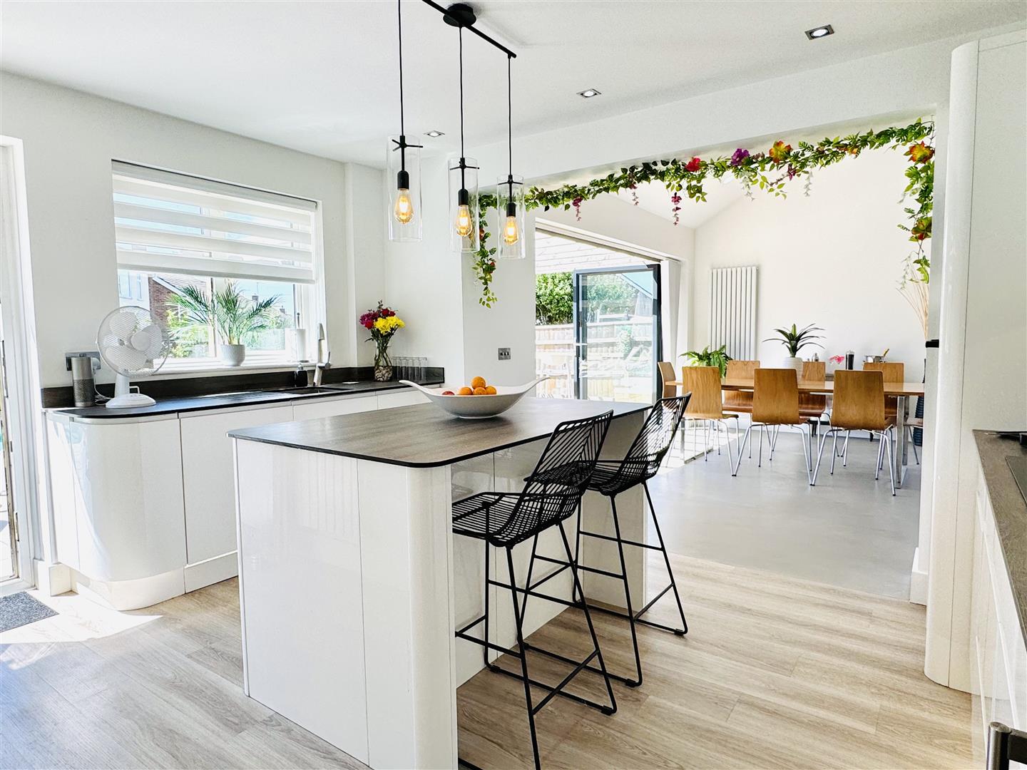 A beautiful living space with a feature vaulted ceiling, double glazed window to front and full height double glazed window to side. Double glazed bi-folding doors opens to the outside decking and pergola leading to the swimming pool. There are designer style radiators, spot lighting and opens through to the kitchen.